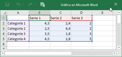 El gráfico que se ha insertado representa a la tabla de datos de ejemplo la estilo de Excel. Para introducir valores en la hoja de datos,