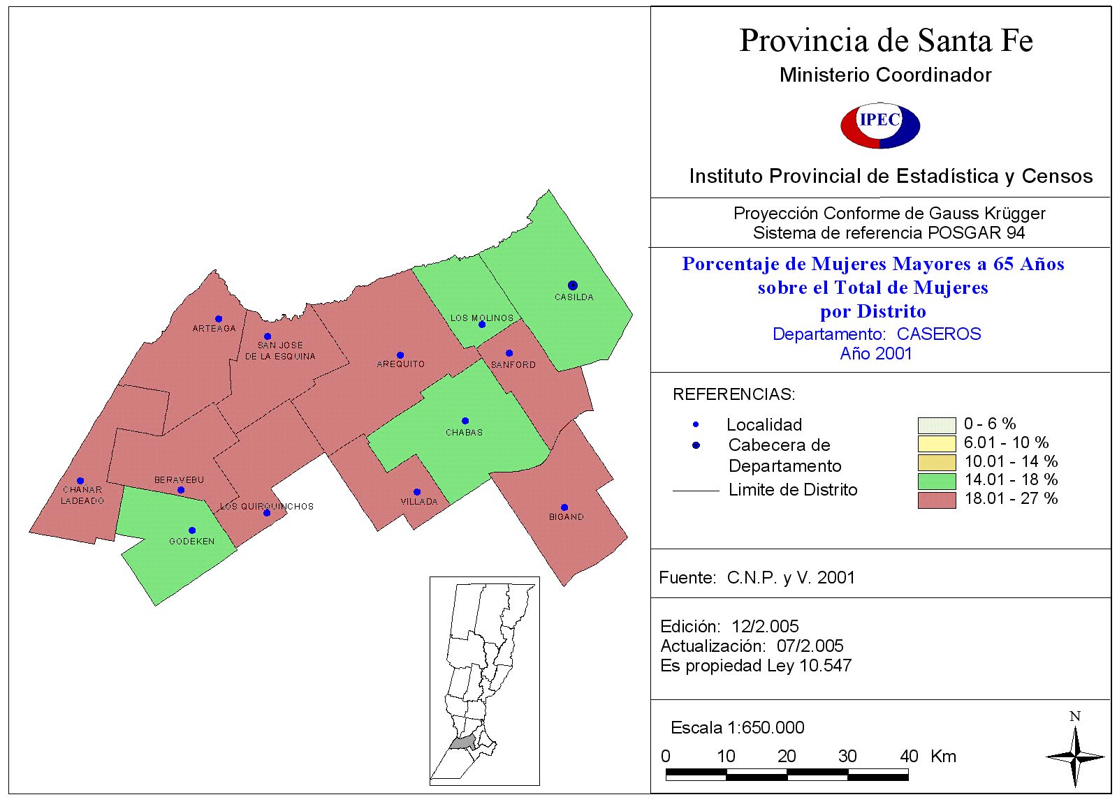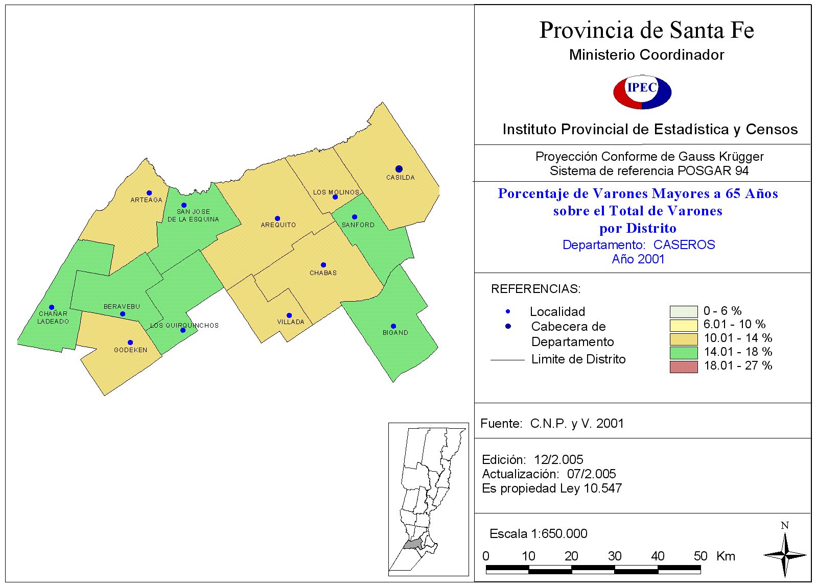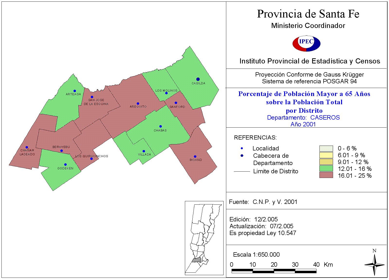 Población Total y porcentaje de población de 65 años y más, según Departamento y Localidad. Departamento Caseros. Año 2001