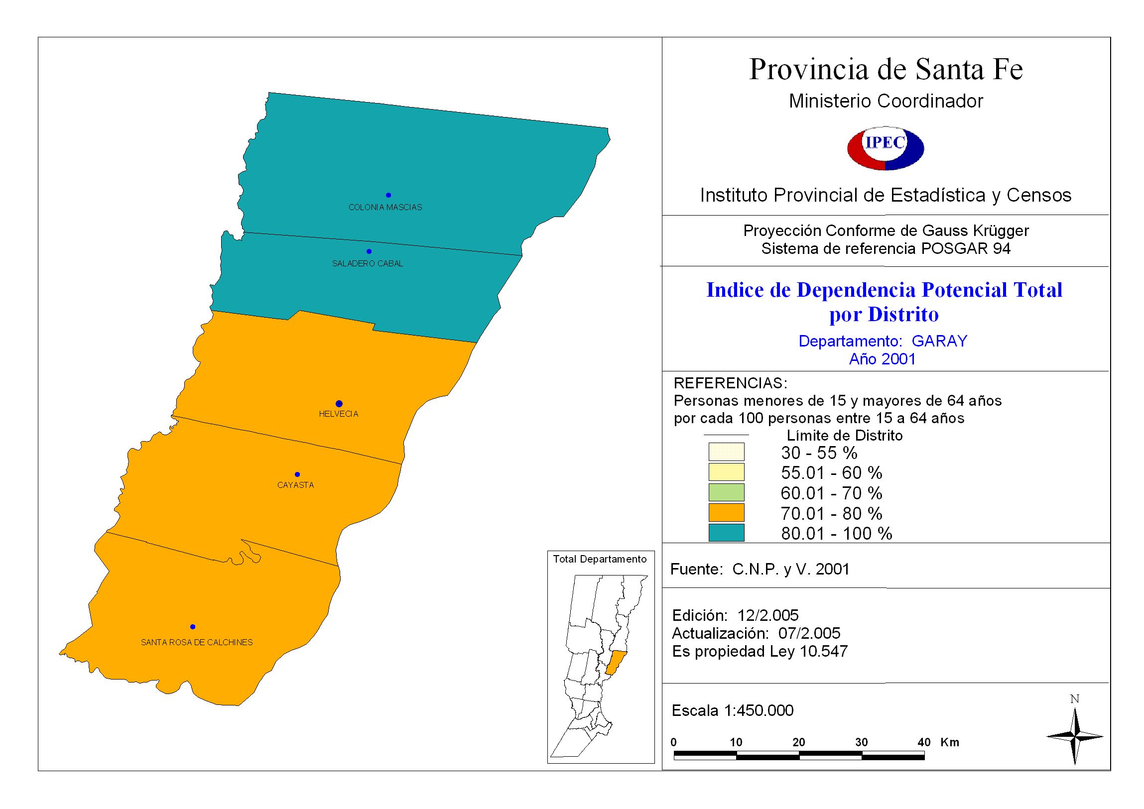 Indice de Dependencia Potencial Total por Distrito. Departamento Garay. Año 2001