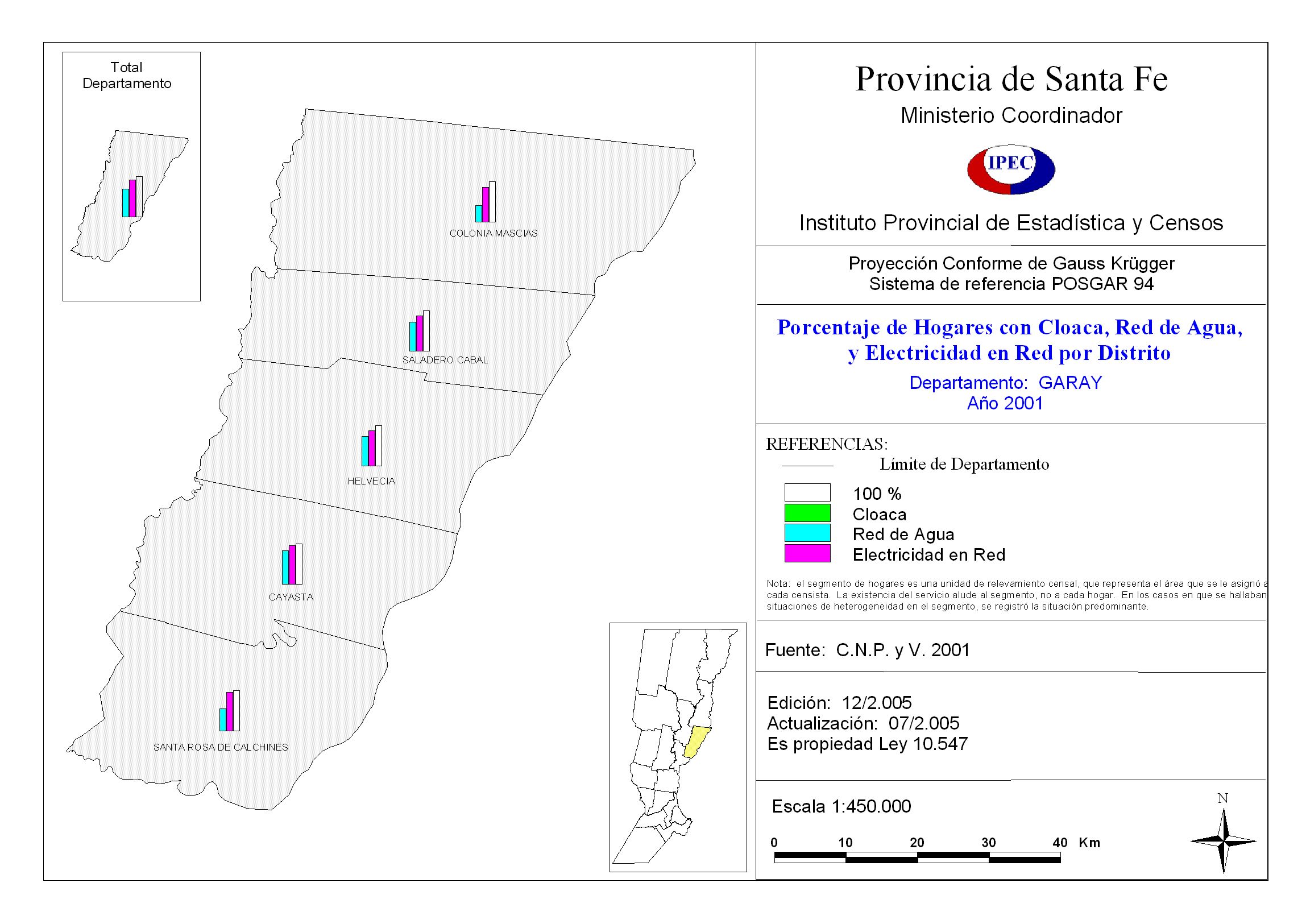 Porcentaje de Hogares con Cloaca, Red de Agua, y Electricidad en Red por Distrito. Departamento Garay. Año 2001