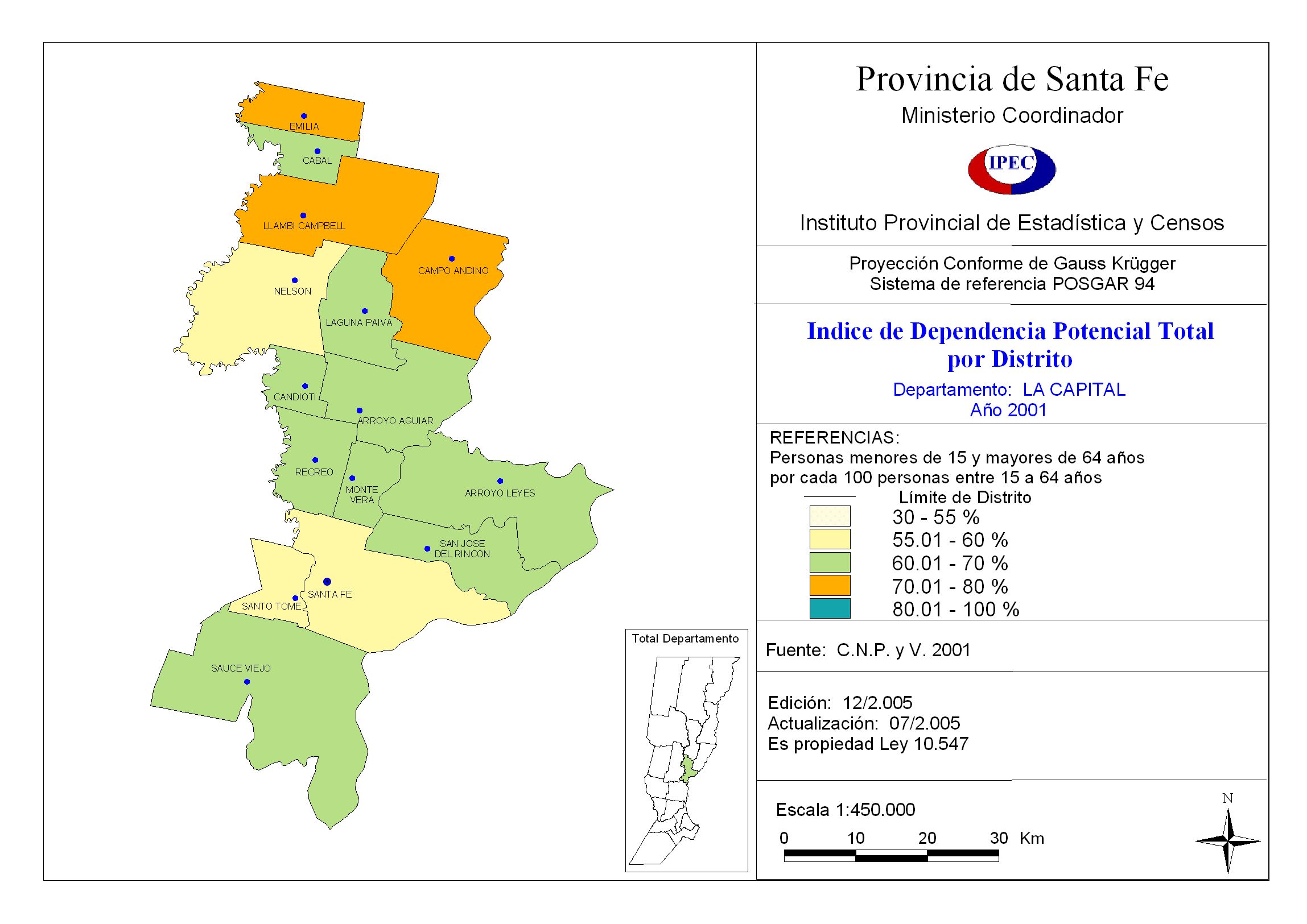 Indice de Dependencia Potencial Total por Distrito. Departamento La Capital. Año 2001
