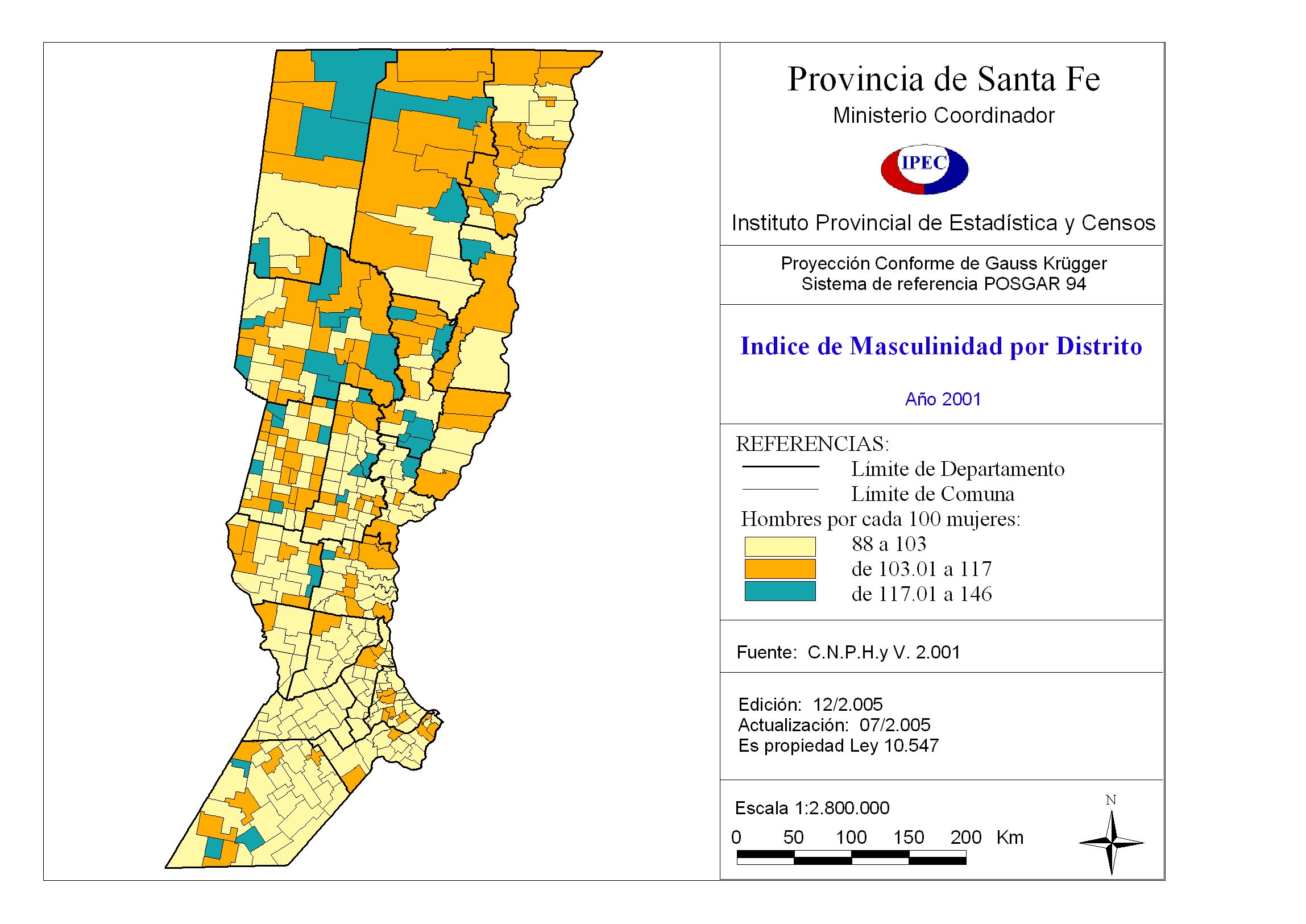 Índice de masculinidad por distrito. Provincia Santa Fe. Año 2001