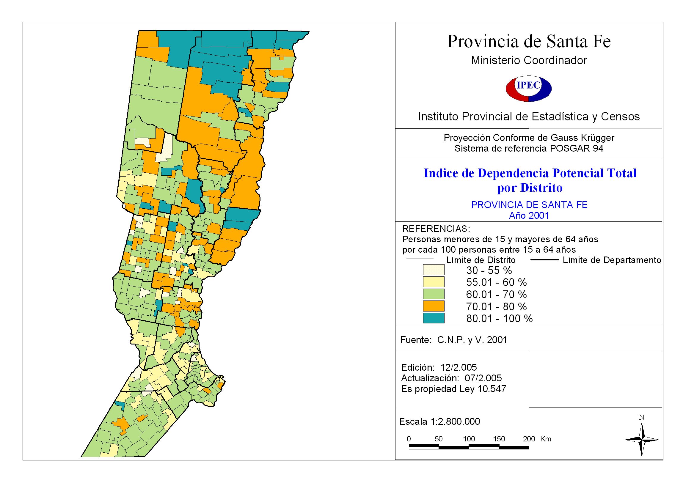 Indice de Dependencia Potencial Total por Distrito. Provincia de Santa Fe. Año 2001
