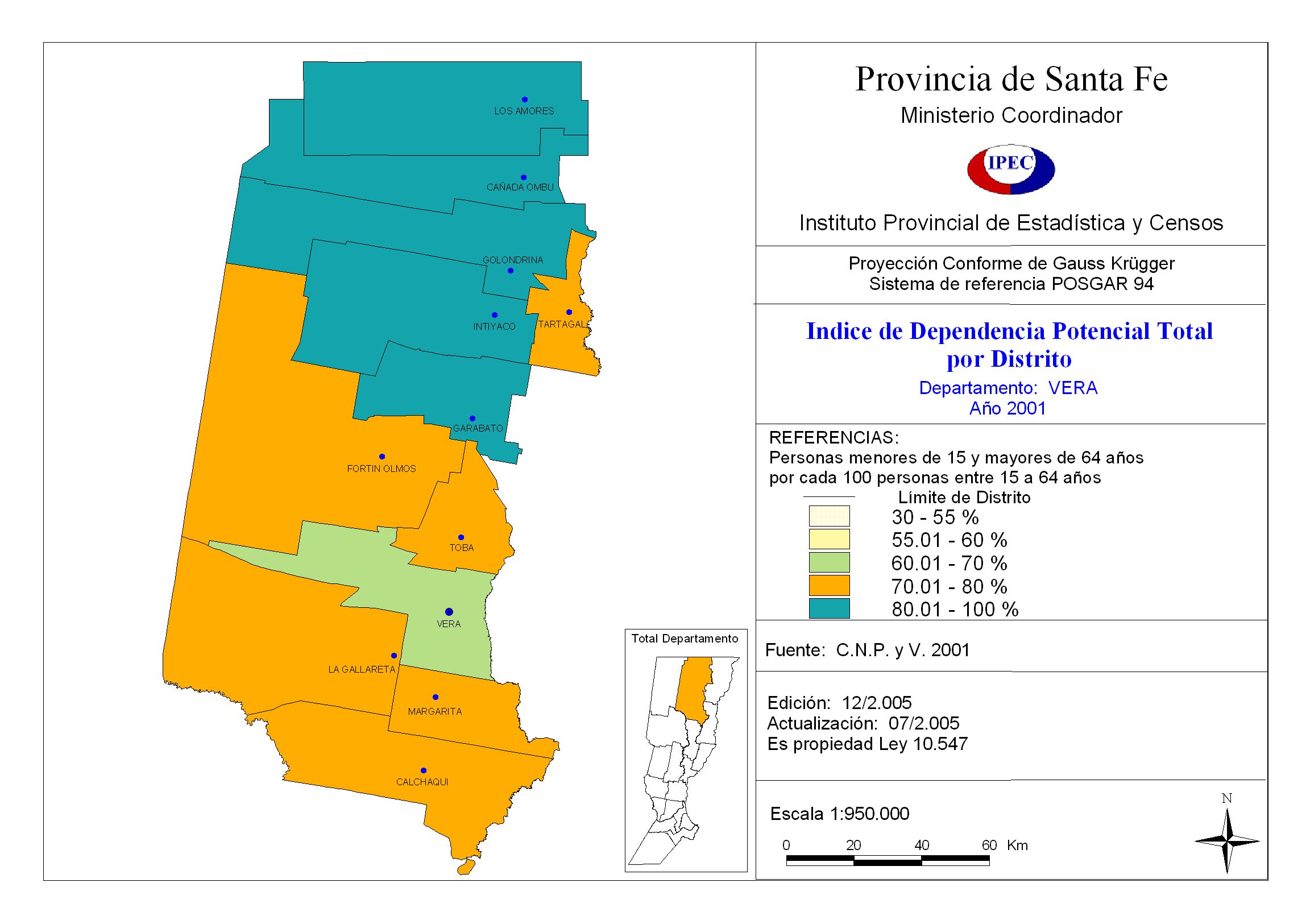 Indice de Dependencia Potencial Total por Distrito. Departamento Vera. Año 2001