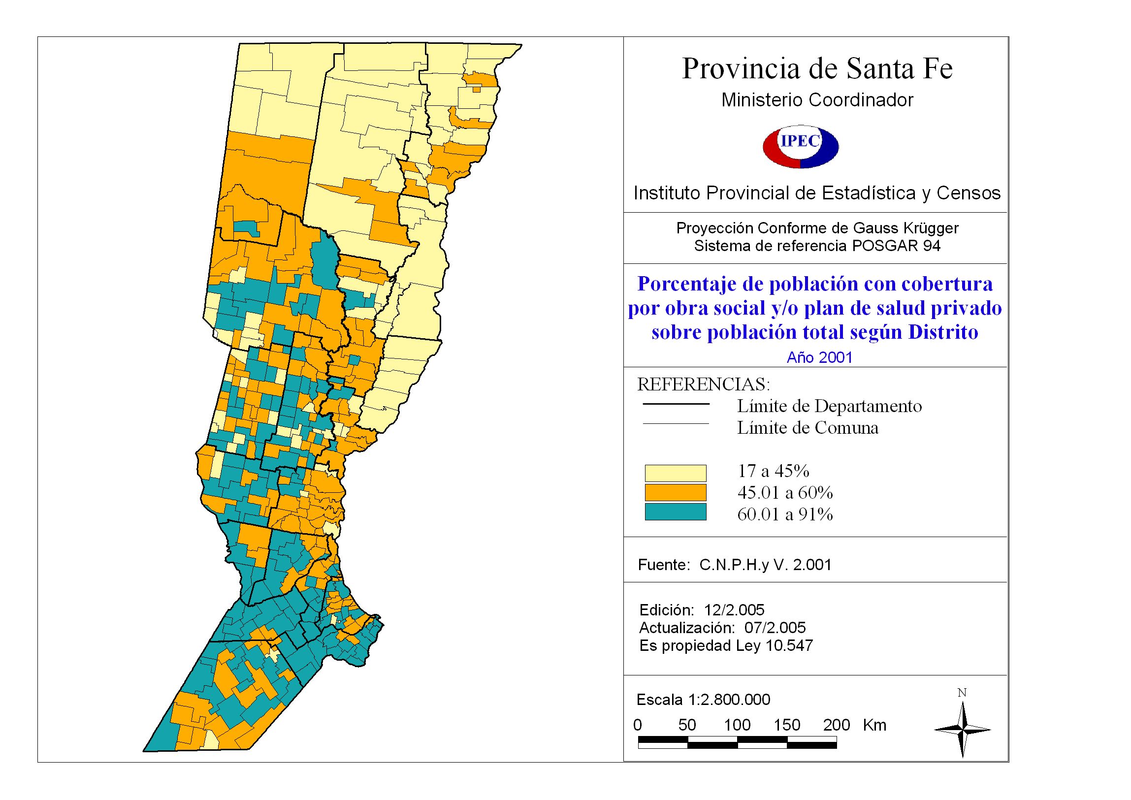 Porcentaje de población con cobertura por obra social y/o plan de salud privado sobre población total según distrito. Provincia Santa Fe. Año 2001