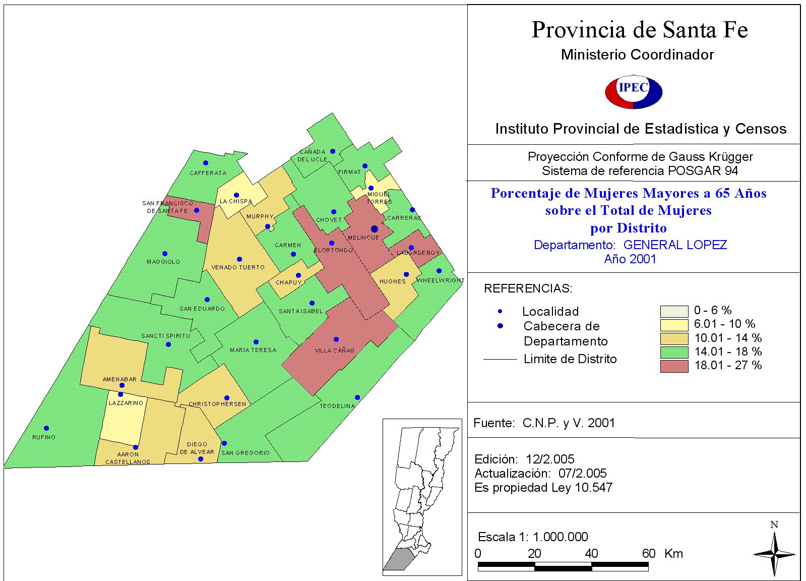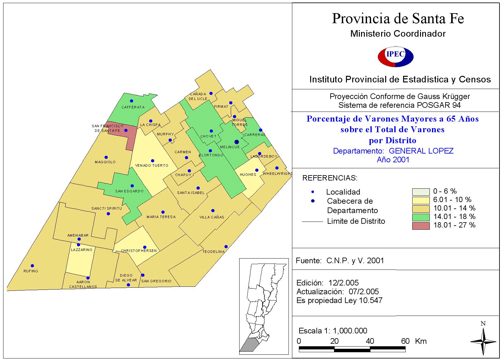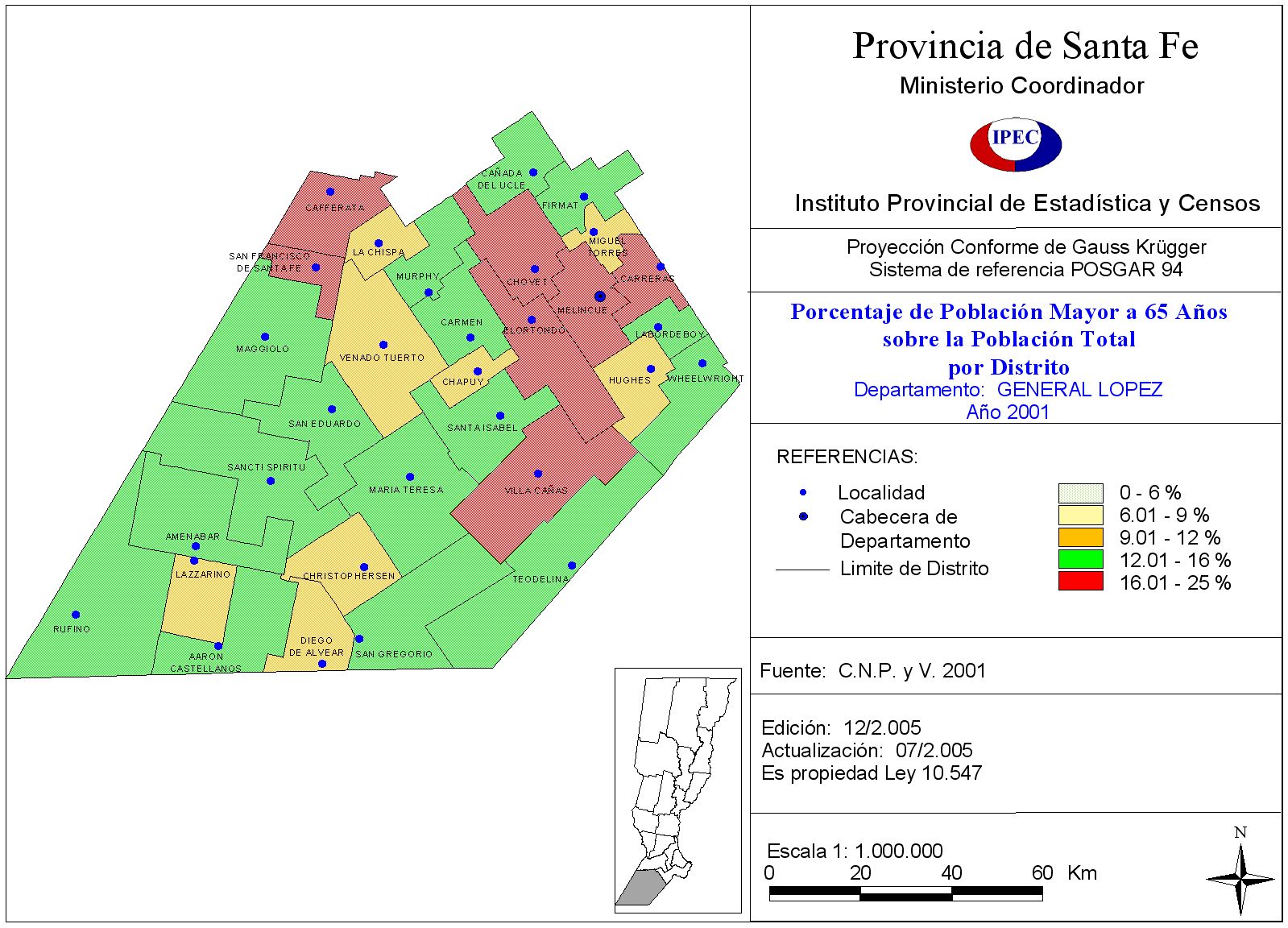 Población Total y porcentaje de población de 65 años y más, según Departamento y Localidad. Departamento General López. Año 2001