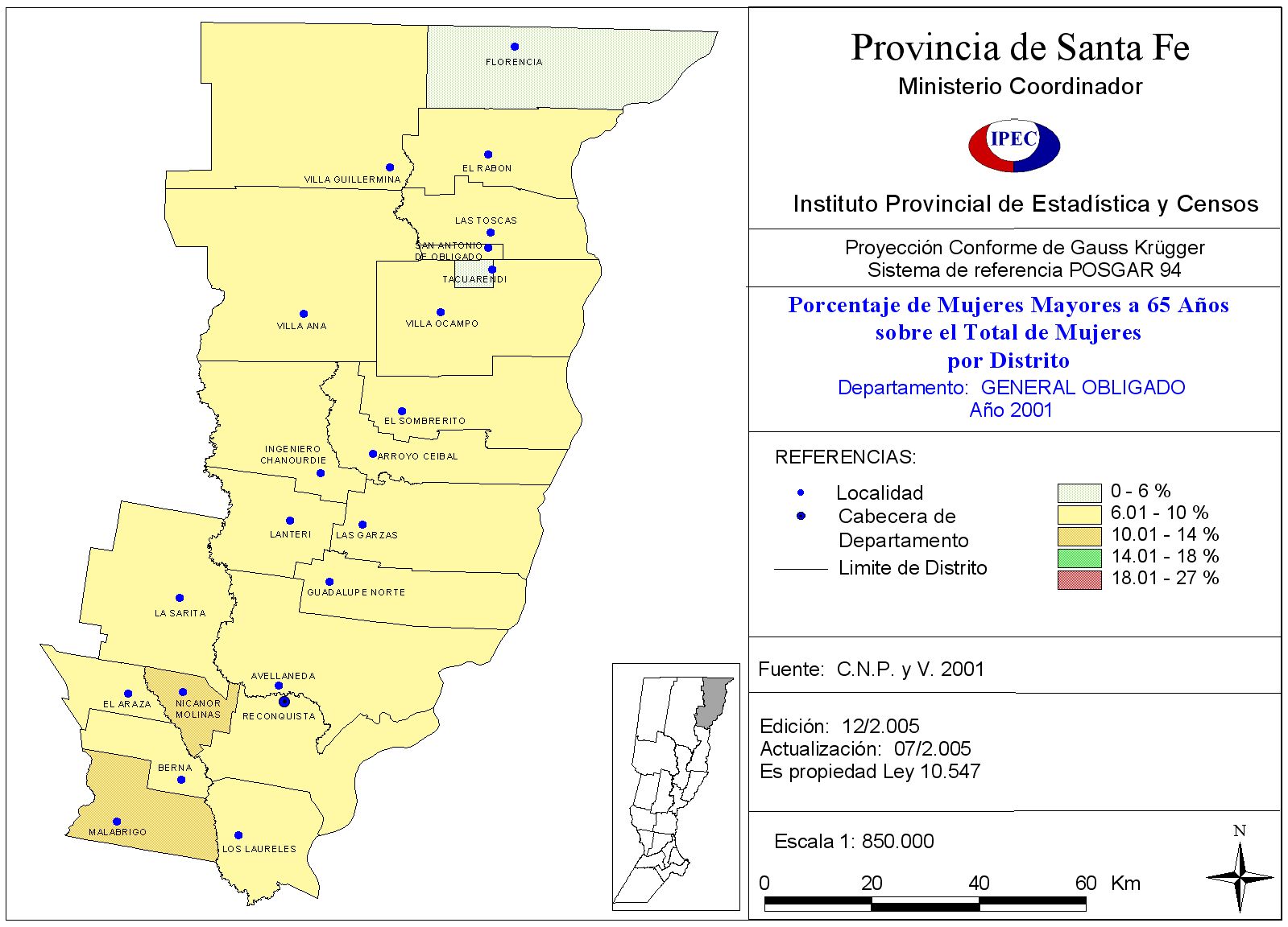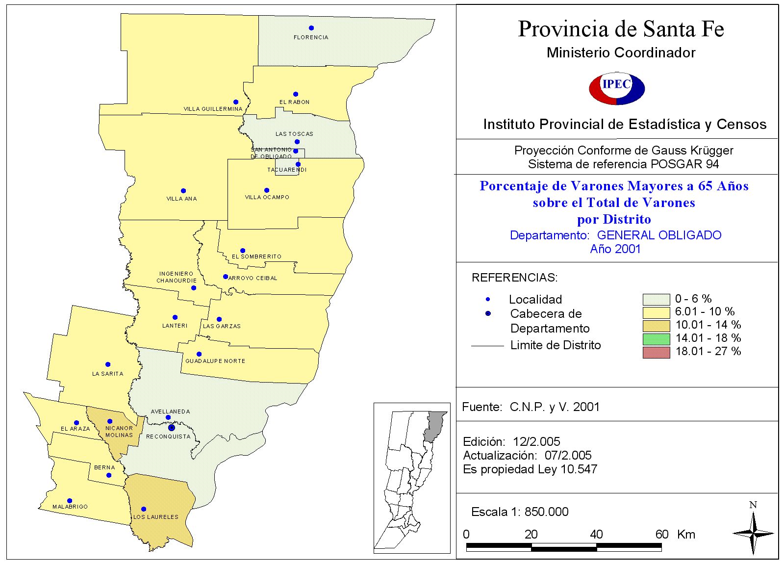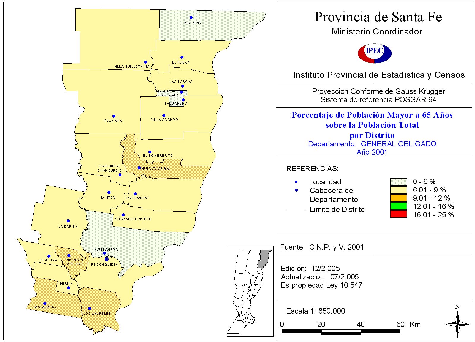 Población Total y porcentaje de población de 65 años y más, según Departamento y Localidad. Departamento General Obligado. Año 2001