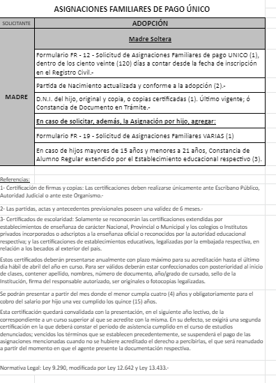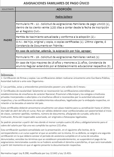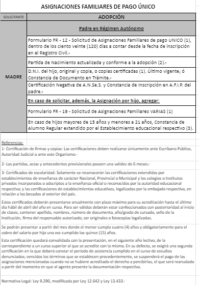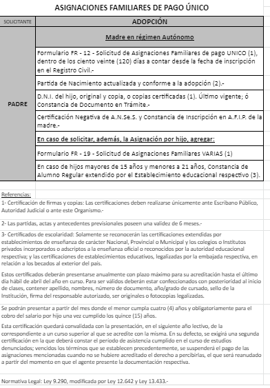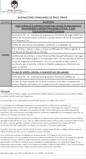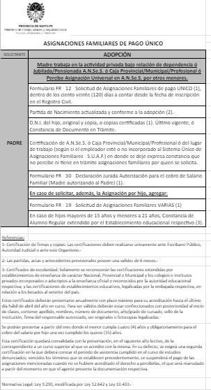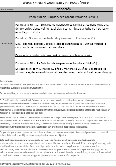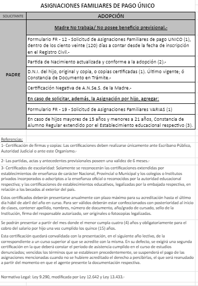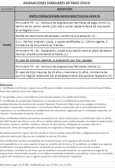 | 33 | Adopción | Madre | Padre trabaja en la actividad privada bajo relación de dependencia ó Monotributista ó Jubilado/Pensionado A.N.Se.S. ó Caja Provincial/Municipal/Profesional