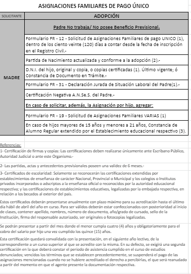 | 39 | Adopción | Padre | Madre trabaja en la actividad privada bajo relación de dependencia ó Jubilada/Pensionada A.N.Se.S. ó Caja Provincial/Municipal/Profesional ó Percibe Asignación Universal en A.N.Se.S. por otros menores.