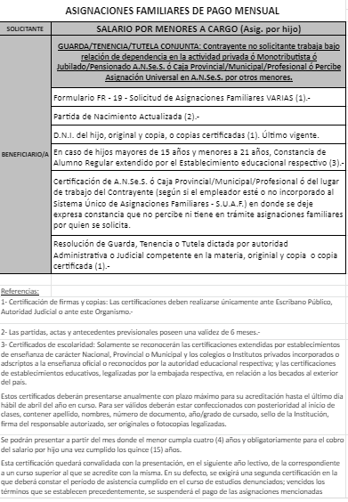 | 27 | Guarda | Beneficiario/a | GUARDA/TENENCIA/TUTELA CONJUNTA: Contrayente no solicitante trabaja bajo relación de dependencia en la actividad privada ó Monotributista ó Jubilado/Pensionado A.N.Se.S. ó Caja Provincial/Municipal/Profesional ó Percibe Asignación Universal en A.N.Se.S. por otros menores.