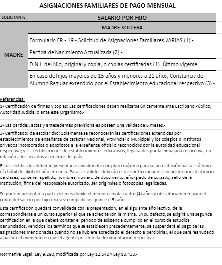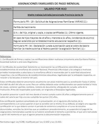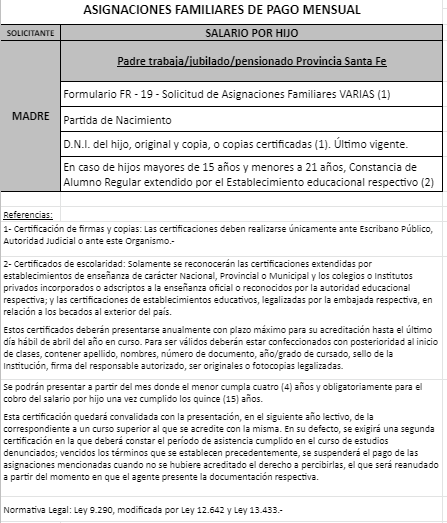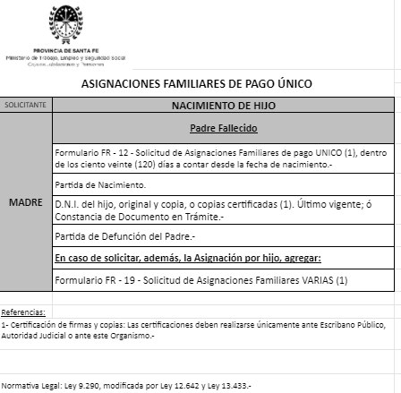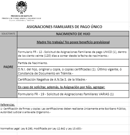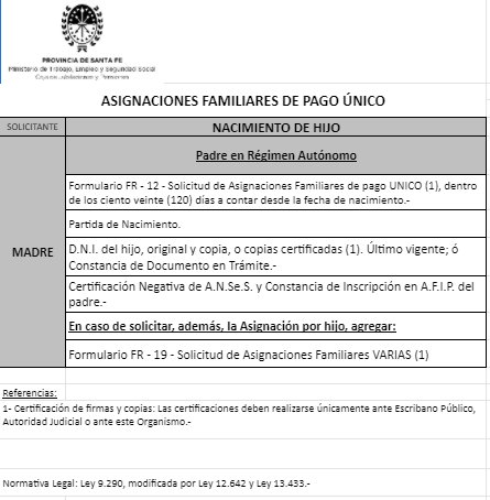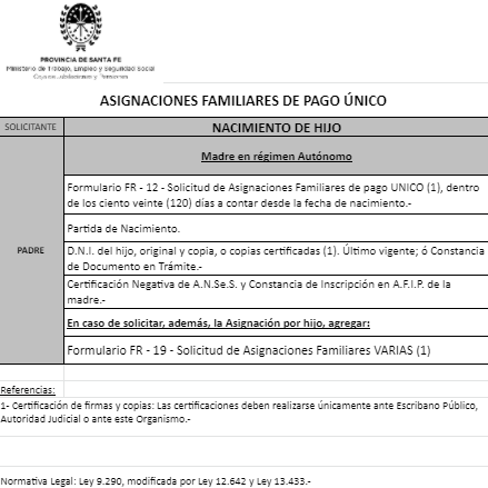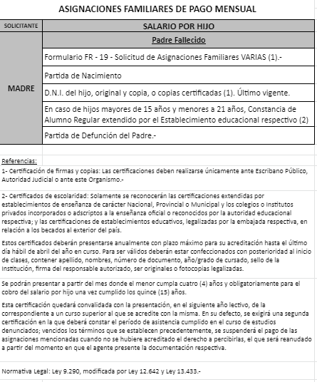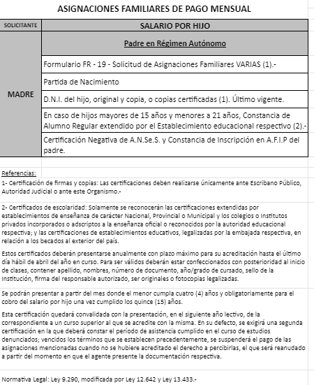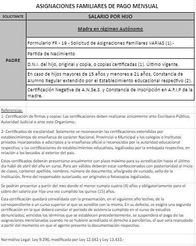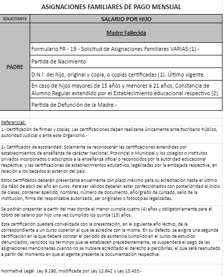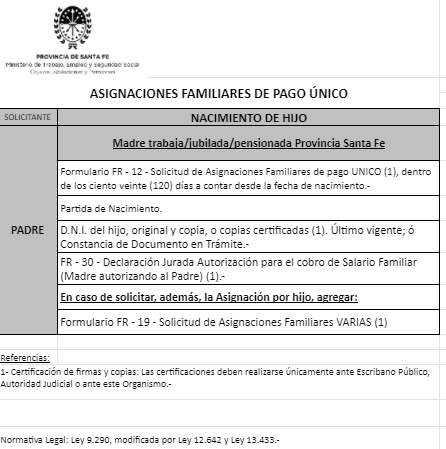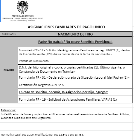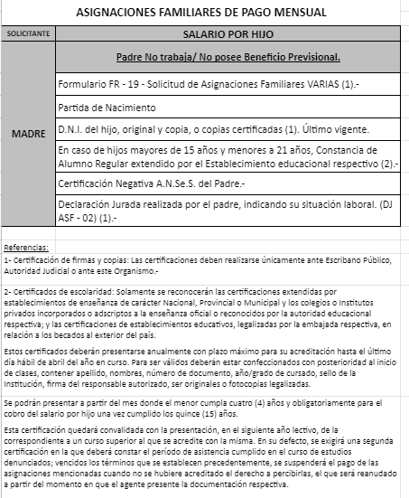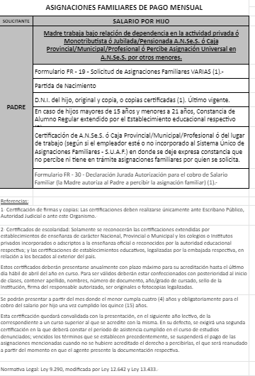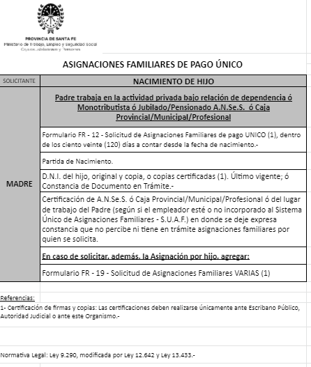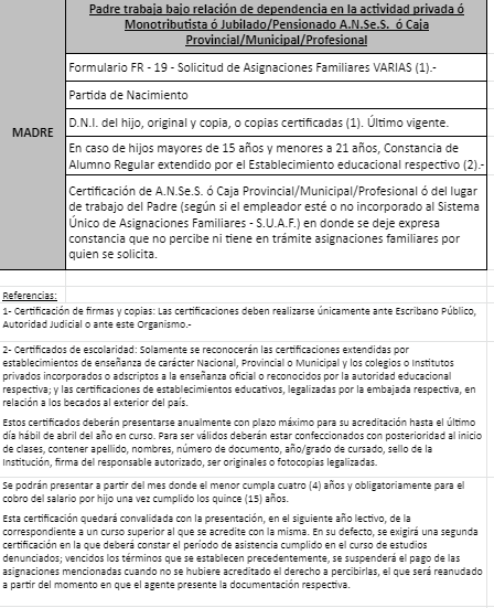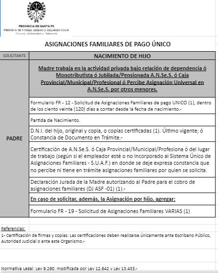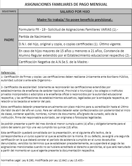 | 48 | Nacimiento | Madre | Padre trabaja en la actividad privada bajo relación de dependencia ó Monotributista ó Jubilado/Pensionado A.N.Se.S. ó Caja Provincial/Municipal/Profesional