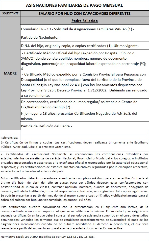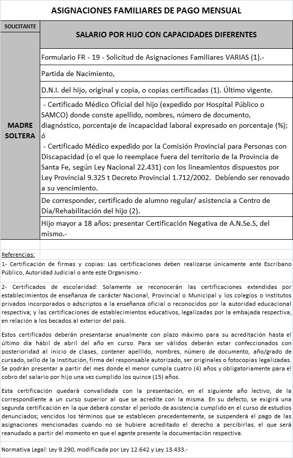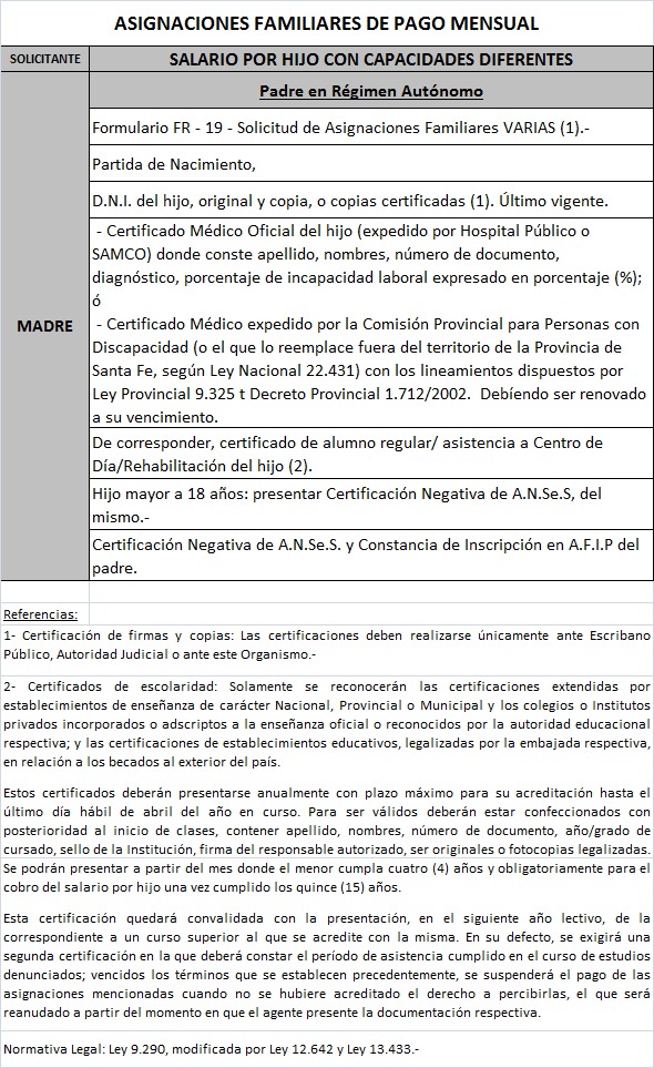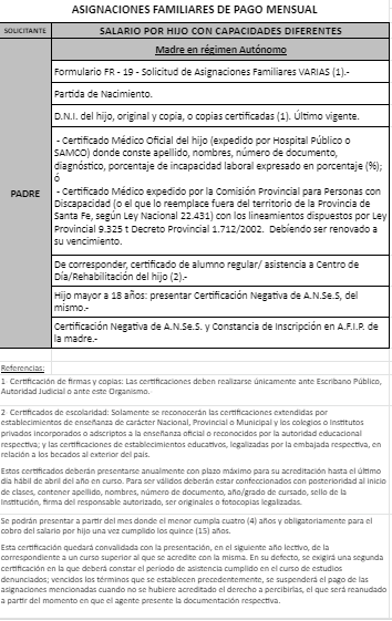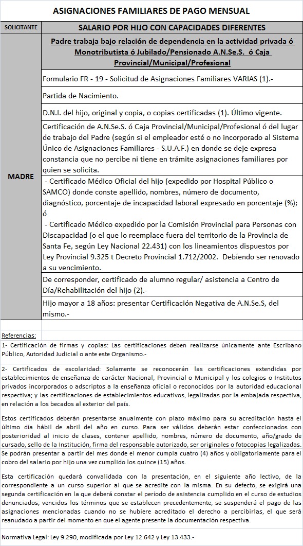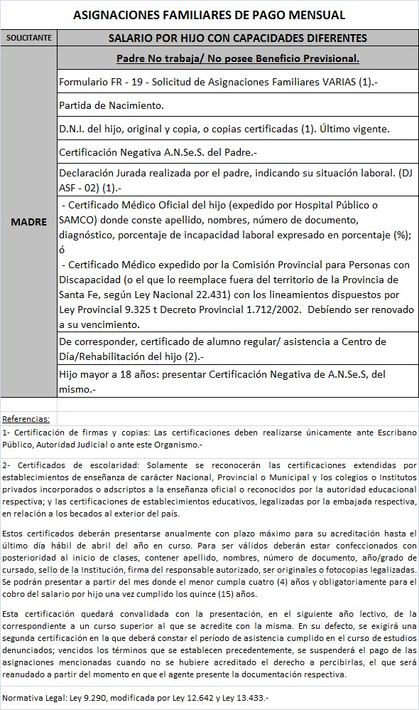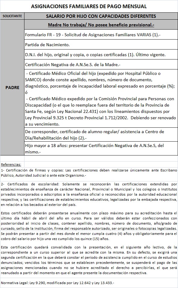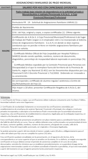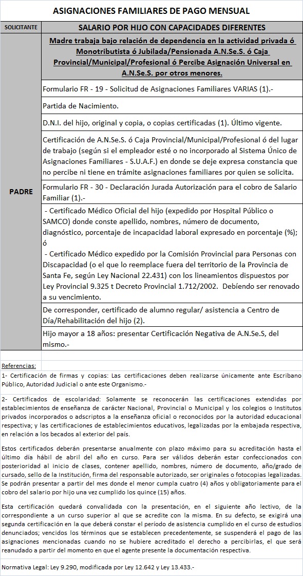 | 64 | Hijo con capacidades diferentes | Madre | Padre trabaja bajo relación de dependenciaen la actividad privada ó Monotributista ó Jubilado/Pensionado Anses ó Caja Provincial/Municipal/Profesional |