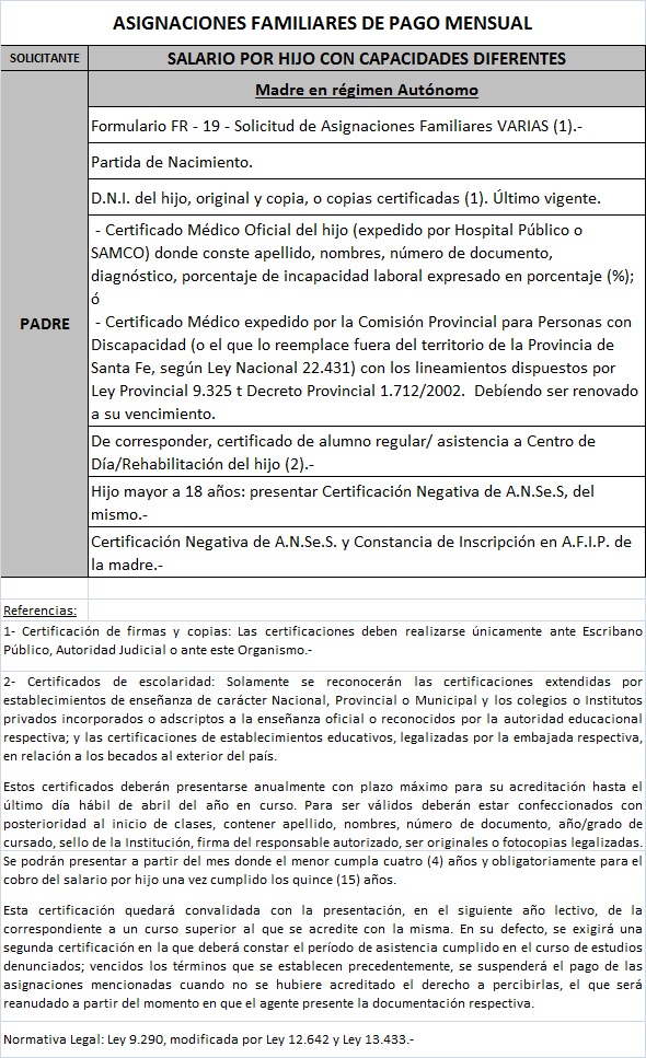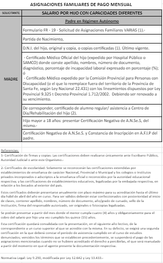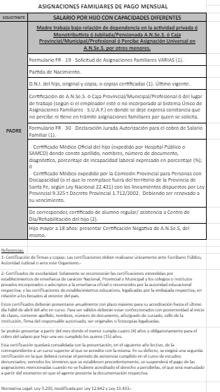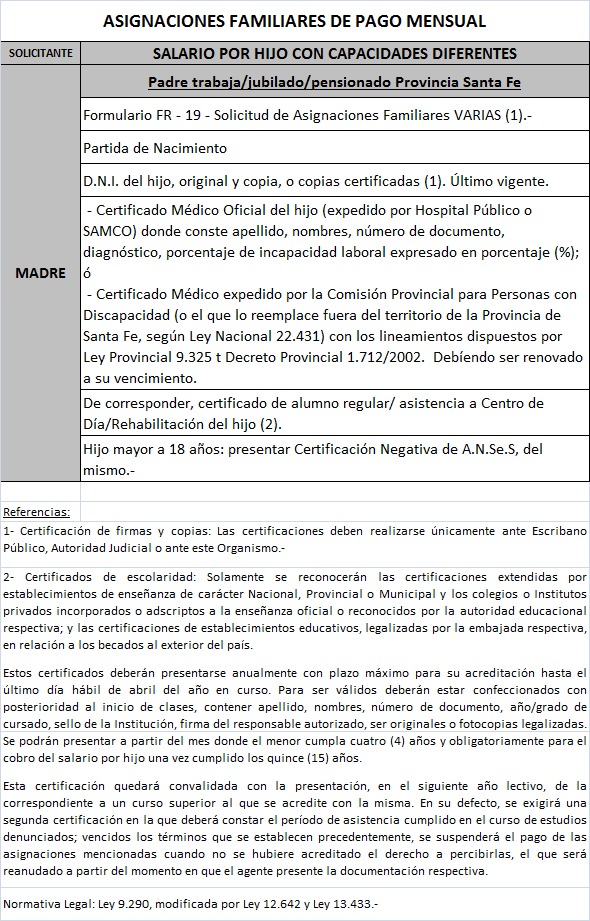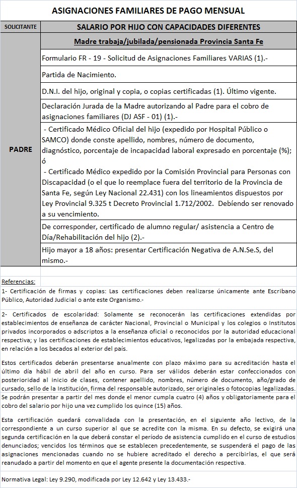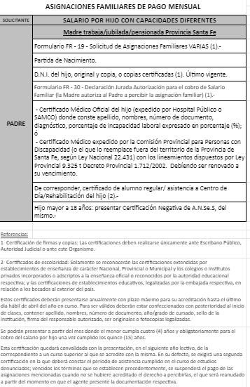 | 63 | Hijo con capacidades diferentes | Madre | Padre trabaja/jubilado/pensionado Provincia de Santa fe |