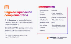 La Caja de Jubilaciones y Pensiones informa que el día 16 de marzo del corriente año se liquidará al sector pasivo la complementaria correspondiente a los meses de diciembre de 2025 (ajuste por inflación) y enero de 2026 correspondiente a los sectores: Administración central, Docente, Seguridad, API y Catastro, Imprenta oficial, Arte de curar, Ex Dipos, ENRESS, Vialidad, Poder Legislativo (Personal Escalafonado), Caja de Previsión Social, Personal del Tribunal de Cuentas y ASSA; mientras que el sector Bancario percibirá el incremento correspondiente al mes de enero de 2026.