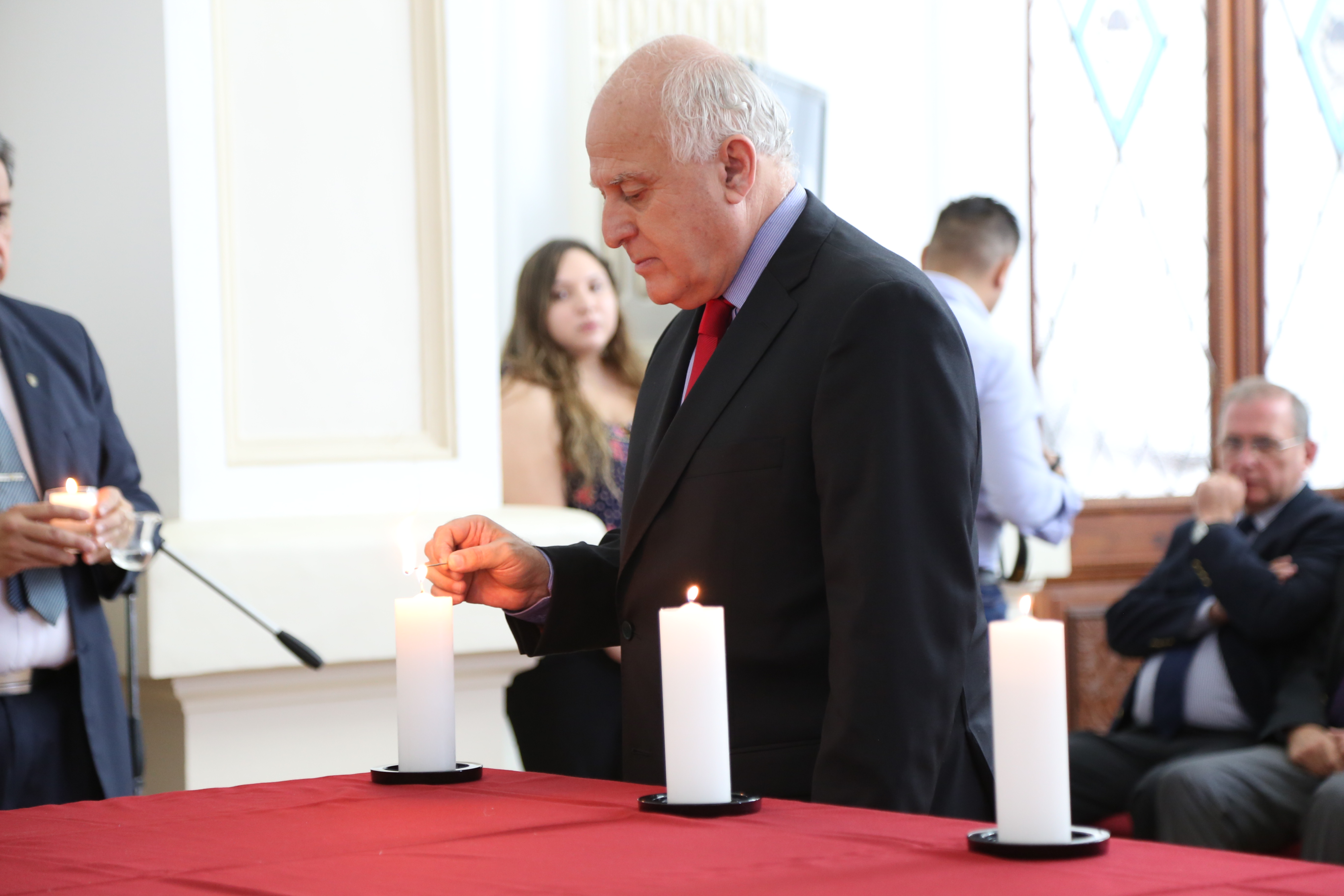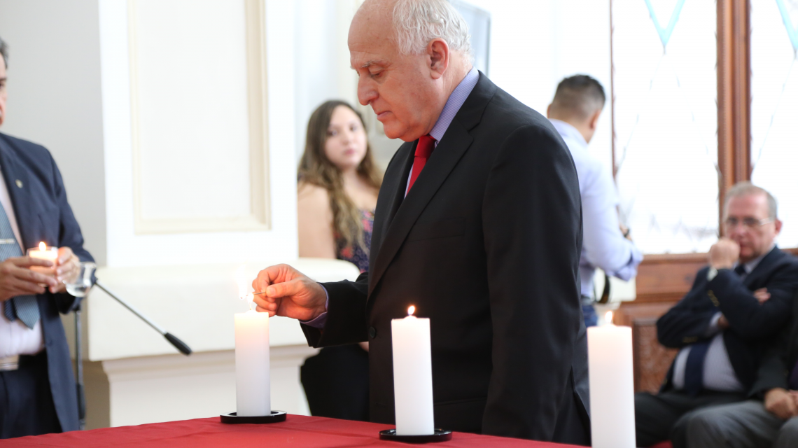 Durante la ceremonia se proyectó un video con testimonio de sobrevivientes de los campos de concentración de la Segunda Guerra Mundial y luego se encendieron seis velas, una por cada millón de judíos víctimas del genocidio.