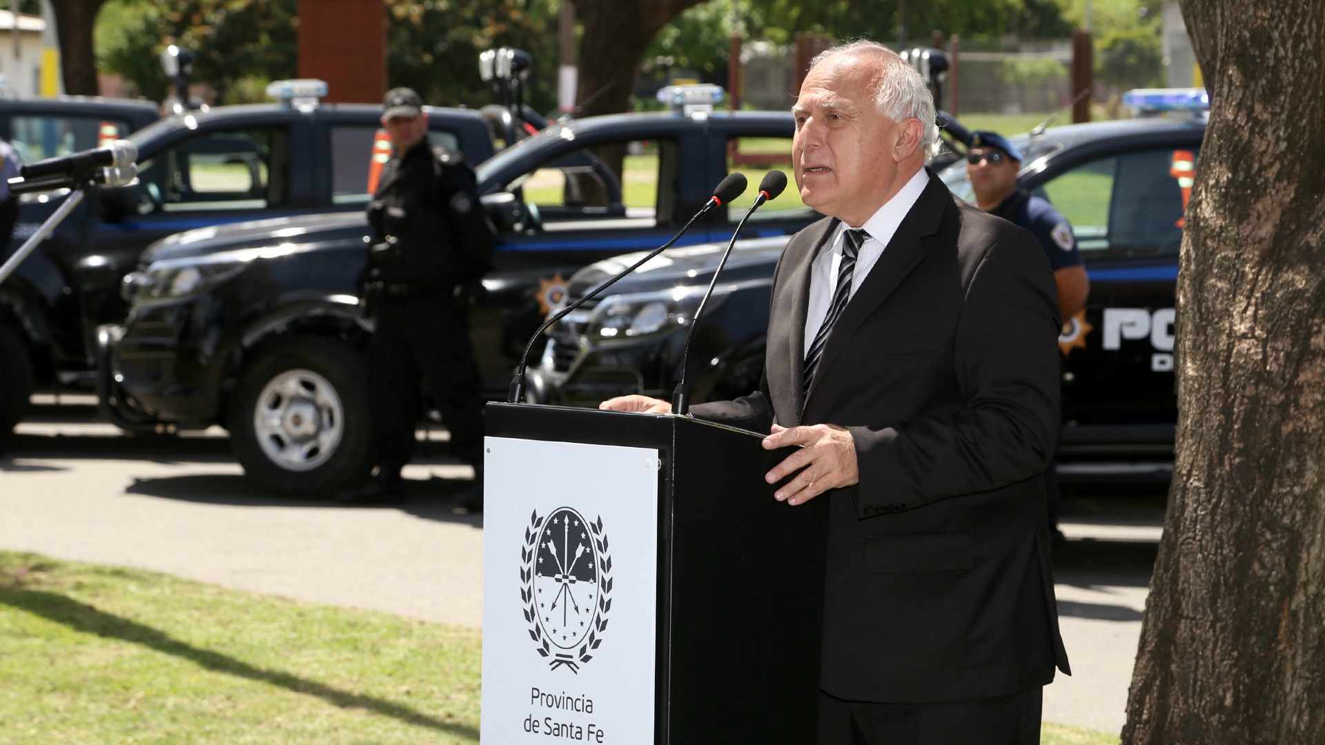 “La seguridad de las personas, la convivencia, y bajar los índices de violencia en la provincia de Santa Fe es un objetivo primordial de nuestra gestión, que obviamente no elimina otros, pero sí pone a este tema en un lugar de mayor urgencia y prioridad”, aseguró el gobernador durante la actividad que tuvo lugar frente al ingreso al Polideportivo Parque del Mercado.