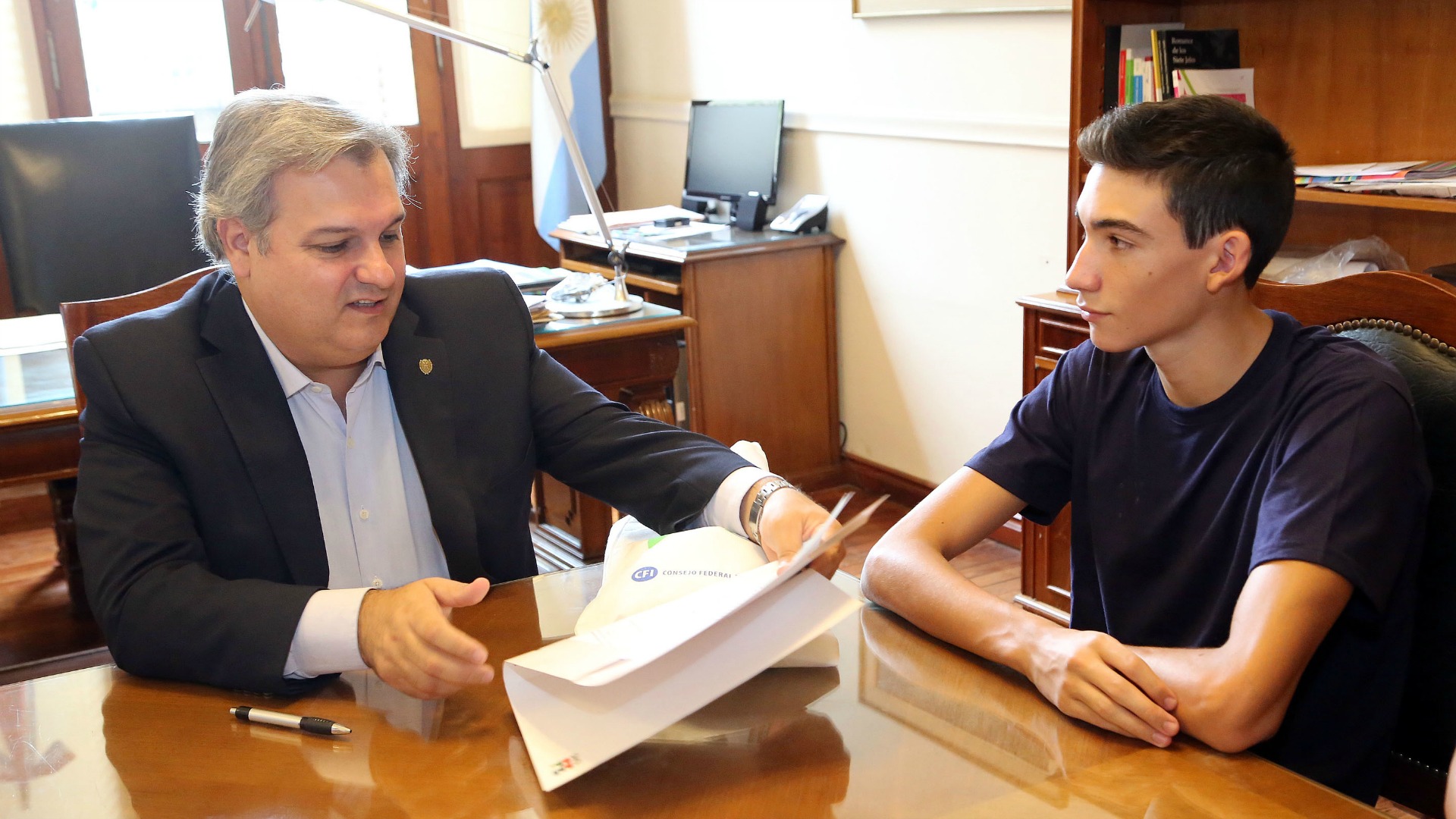 El ministro de Gobierno y Reforma del Estado, Pablo Farías, recibió este jueves en su despacho de Casa de Gobierno a Facundo Signorini, un joven nadador santafesino que competirá entre el 20 y 25 de marzo en los Juegos Parapanamericanos Juveniles 2017 a desarrollarse en San Pablo, Brasil.