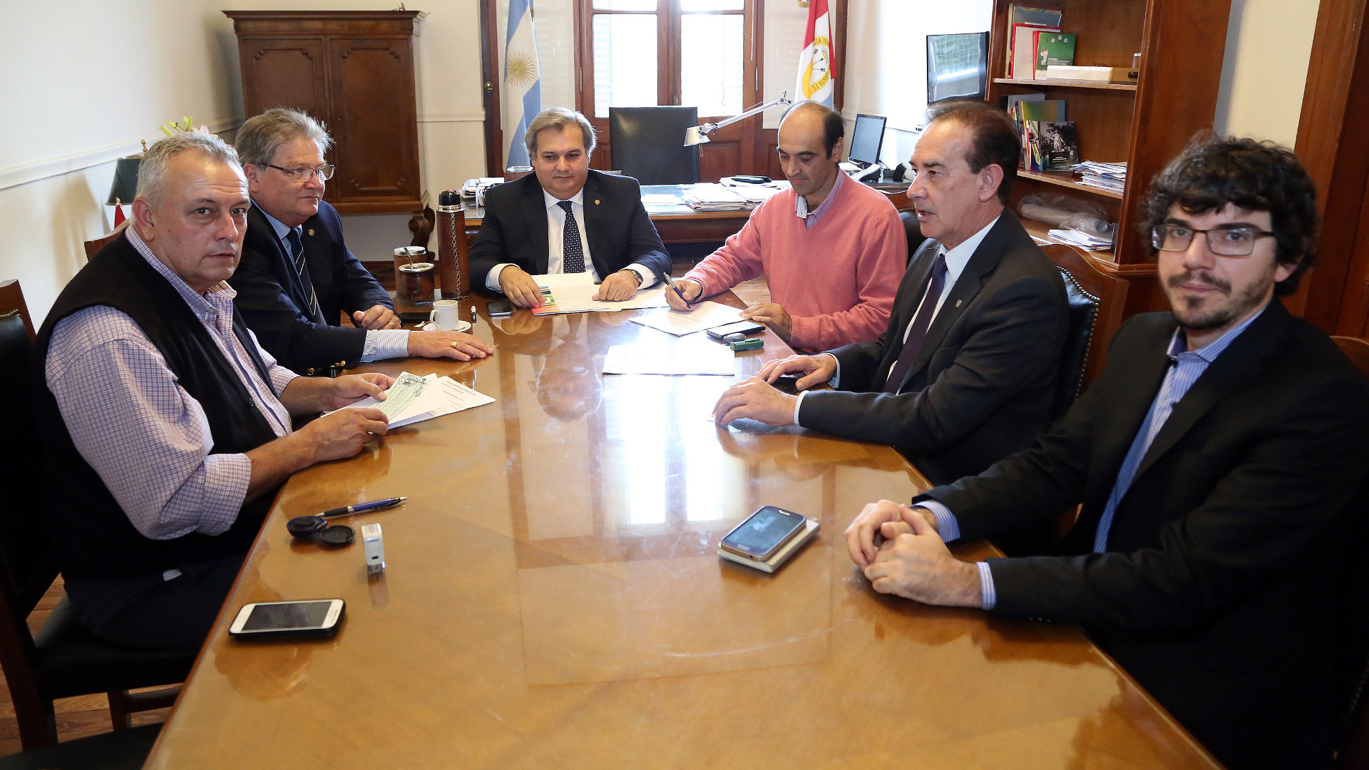 El acto, realizado este jueves en Casa de Gobierno, fue encabezado por el vicegobernador Carlos Fascendini y contó con la presencia del ministro de Gobierno y Reforma del Estado, Pablo Farías; el senador departamental, Orfilio Marcón; el subsecretario de la Gobernación, Exequiel Costamagna; y los presidentes de las comunas beneficiadas de La Sarita, Elbio Peteán; y de Guadalupe Norte, Héctor Zat.