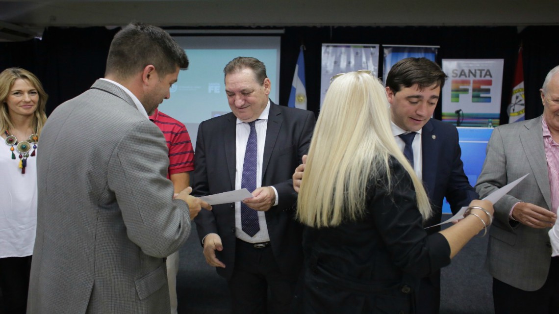 El ministro de Trabajo y Seguridad Social, Julio Genesini, el subsecretario de Asuntos Registrales, Matías Figueroa Escauriza; el defensor del Pueblo de la provincia de Santa Fe, Raúl Lamberto; y el secretario General de UPCN, Jorge Molina, entregaron este martes certificados del Programa de Facilitación de Procesos de Consenso y Abordaje Constructivo de Conflictos, que se desarrolló durante 2017.