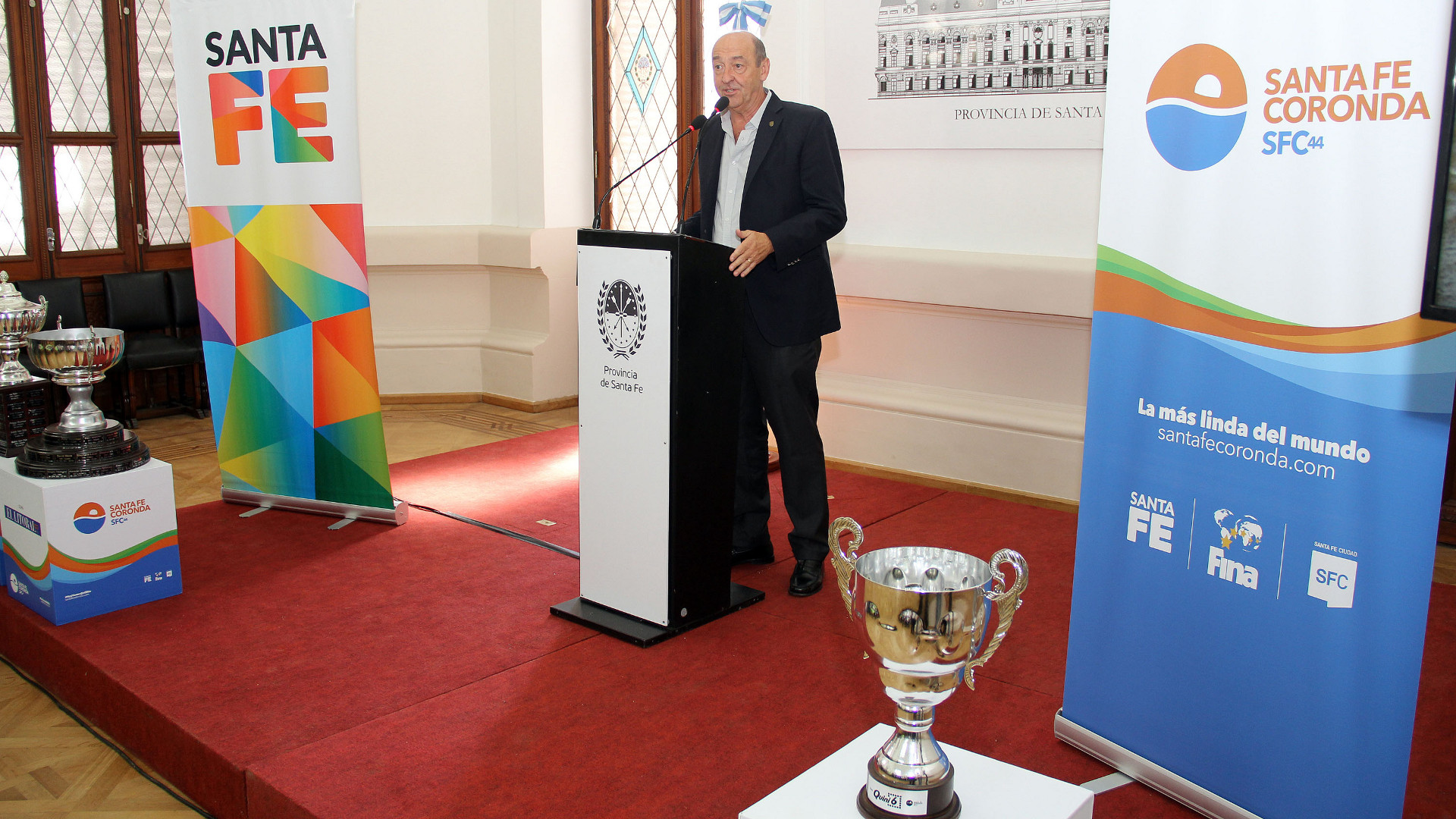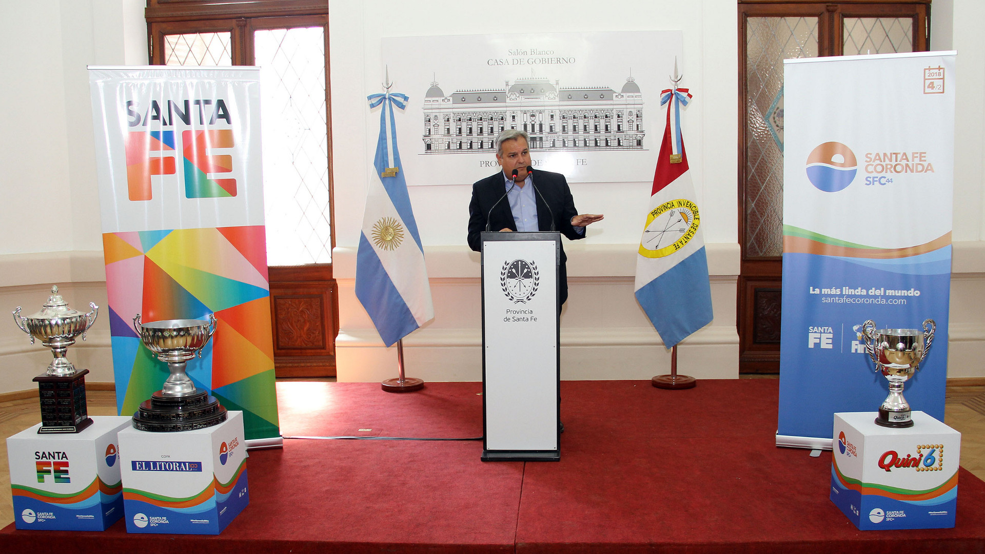 Los ministros de Gobierno y Reforma del Estado, Pablo Farías, y de Desarrollo Social, Jorge Alvarez, encabezaron este viernes en la ciudad capital la presentación oficial de la 44ª edición de la Maratón Santa Fe-Coronda que se disputará este domingo a partir de las 9 horas. El acto se llevó a cabo en el salón Blanco de Casa de Gobierno.