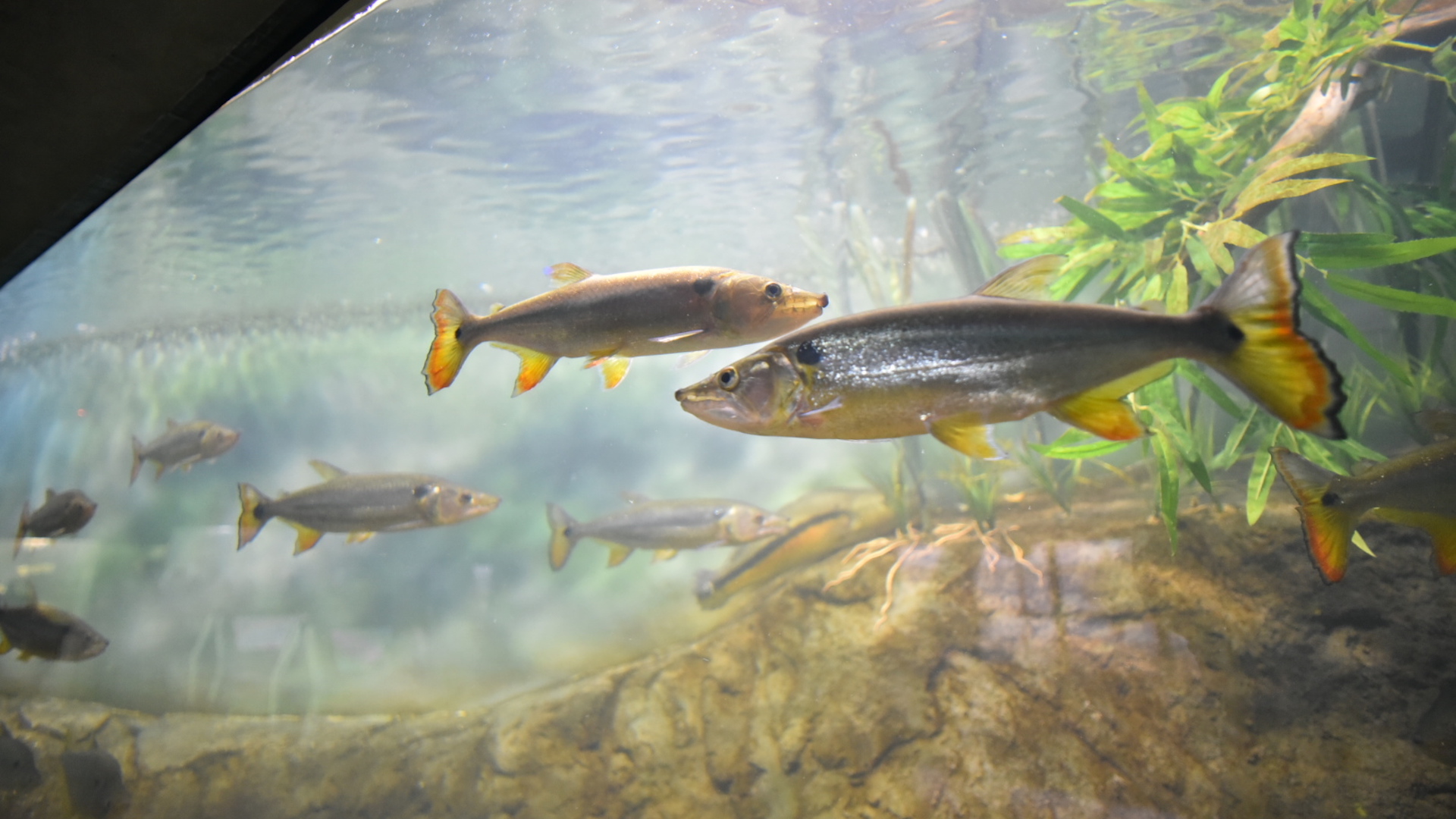 Entre los diferentes tipos de peceras en las salas de muestras, se destacan dos tubos cilíndricos (de 3 metros de diámetro), con fondo acrílico visible desde el área de acceso en el exterior del edificio.