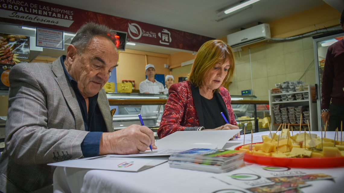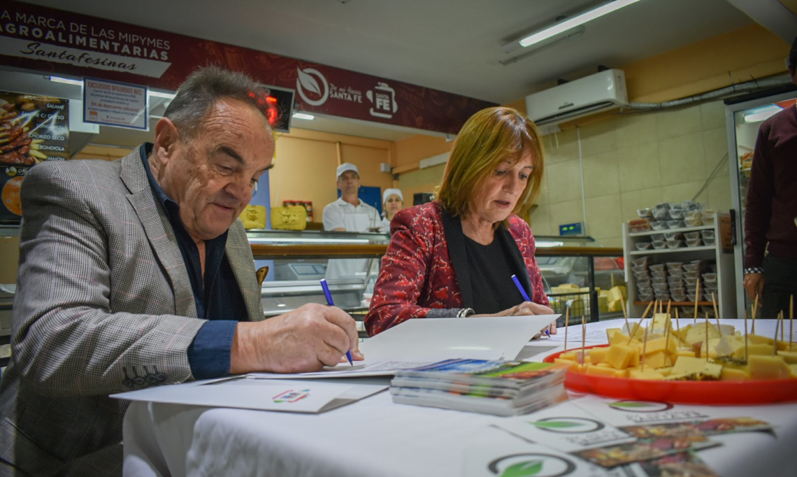La ministra de Producción, Alicia Ciciliani, y el secretario general del Sindicato de Empleados de Comercio de Rosario, Luis Battistelli, encabezaron este jueves la firma del convenio por el cual la Proveeduría Mercantil sindical, ubicada en Corrientes 460 de la ciudad de Rosario, suma a su oferta alimentos de la marca provincial “De Mi Tierra Santa Fe”.