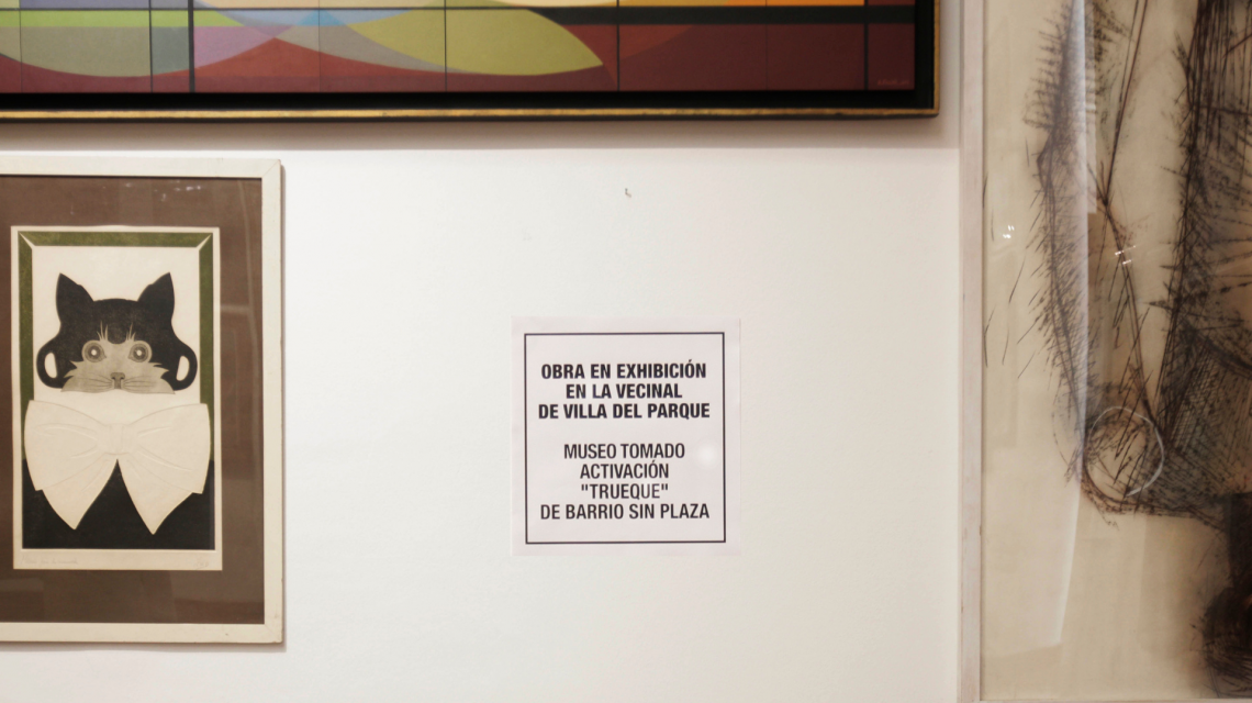 “Museo Tomado”, actualmente en exhibición, propone una movilización institucional en un amplio sentido. La acción de exhibir todo el acervo, de mostrar las entrañas del museo, es una especie de rito para convocar y para convidar. En este marco, el museo invitó a “Barrio sin plaza” a activar la muestra, proponiendo un vínculo con la comunidad. Así se gestó “Trueque”, obra que involucra a los equipos de trabajadores de las áreas Pedagógica, de Montaje, Conservación y Restauración, Reserva, a los residentes culturales del museo y vecinos del barrio Villa del Parque.