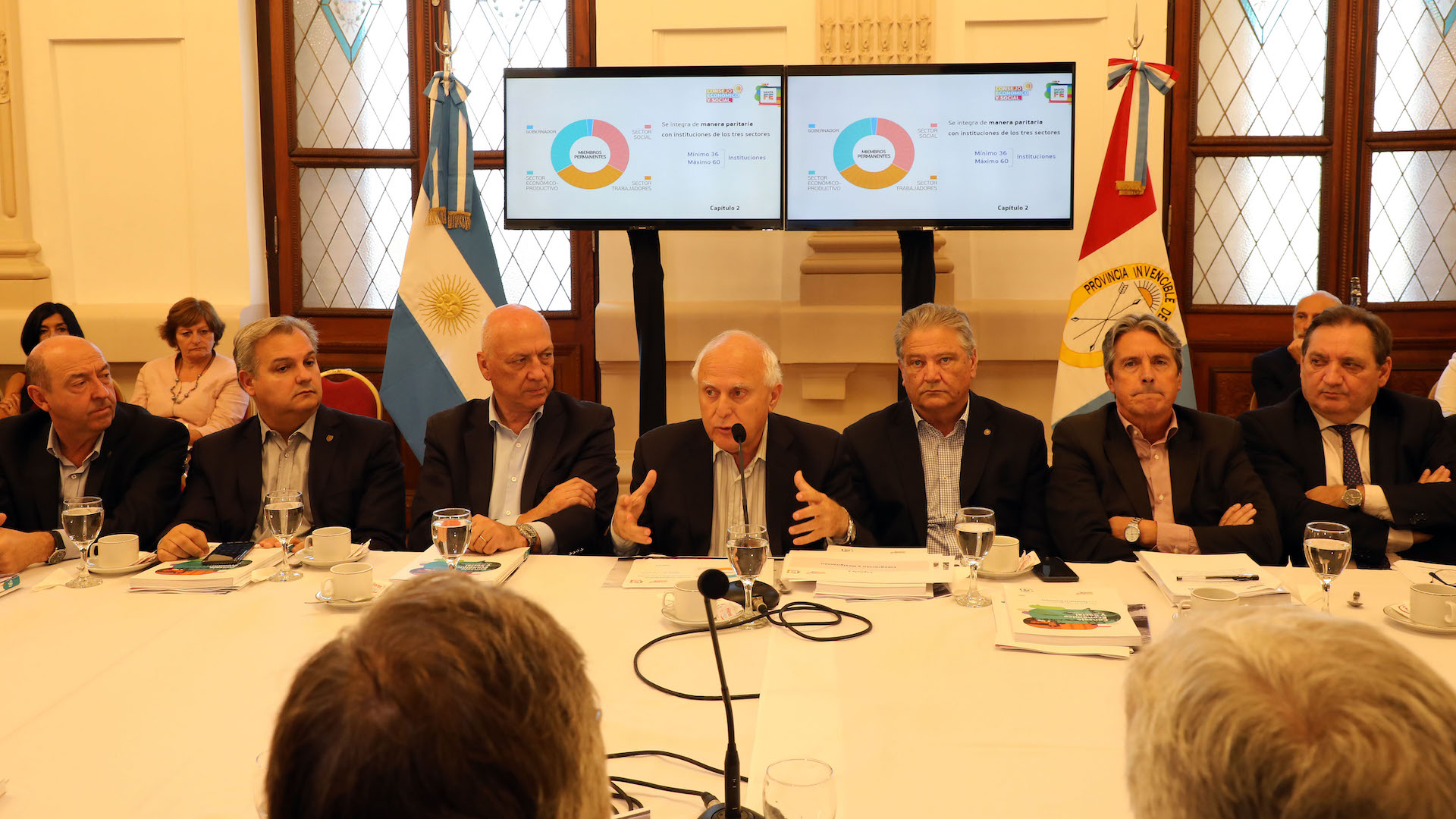 "Gracias a todos los integrantes del Consejo por acompañarnos una vez más, como ha ocurrido en todas las sesiones desarrolladas desde su creación; y a los presidentes de las cámaras de Diputados, Antonio Bonfatti, y de Senadores y vicegobernador, Carlos Fascendini, porque más allá de los temas que generalmente tratamos en estas sesiones hoy estamos presentando el proyecto de ley de creación del Consejo Económico y Social", manifestó Lifschitz.