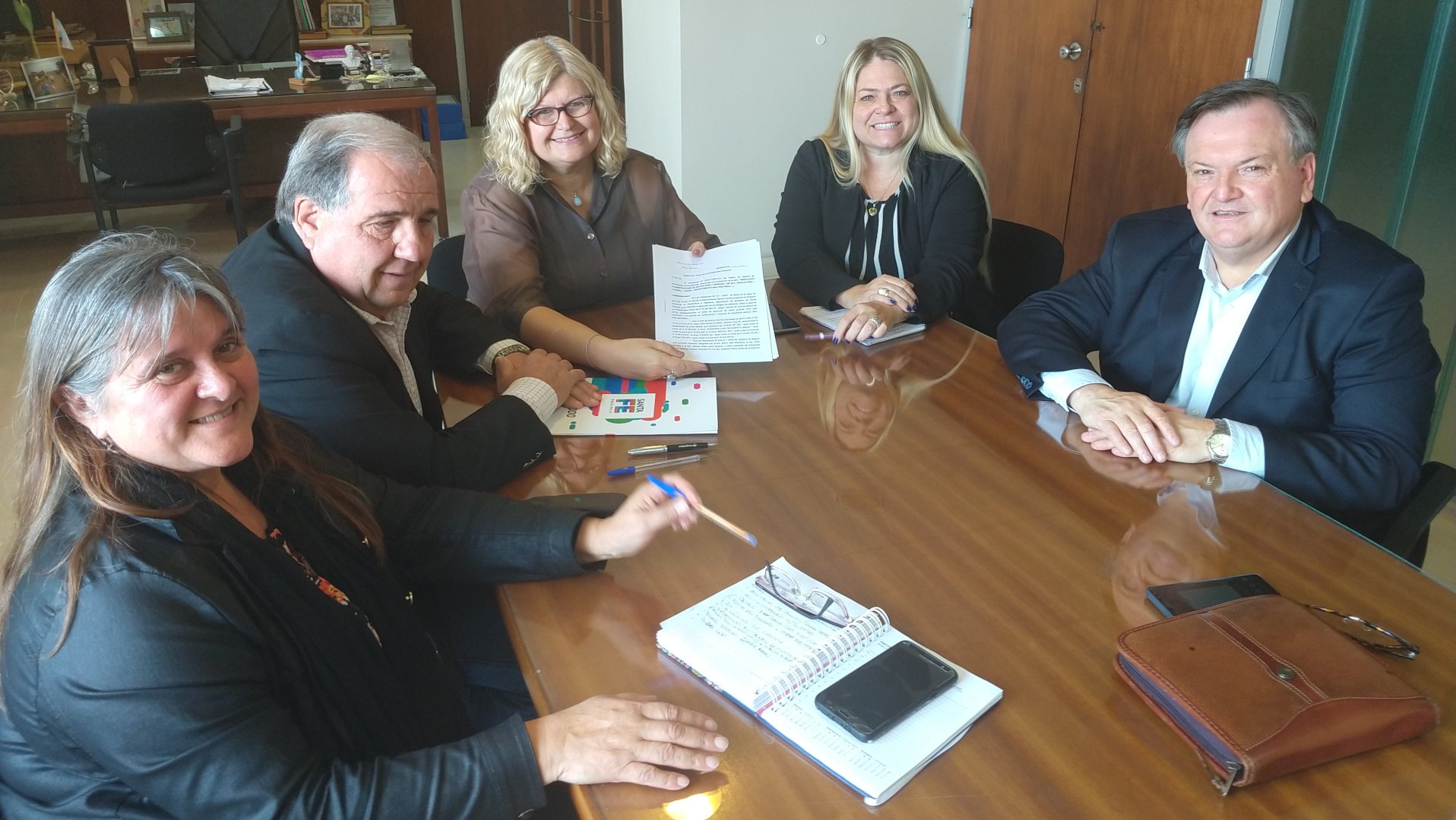 La firma se realizó en una reunión que mantuvieron con el senador del departamento San Cristóbal, Felipe Michlig, y la intendenta electa de Ceres, Alejandra Dupouy, para analizar los avances de las obras de edificios educativos en marcha en la ciudad.