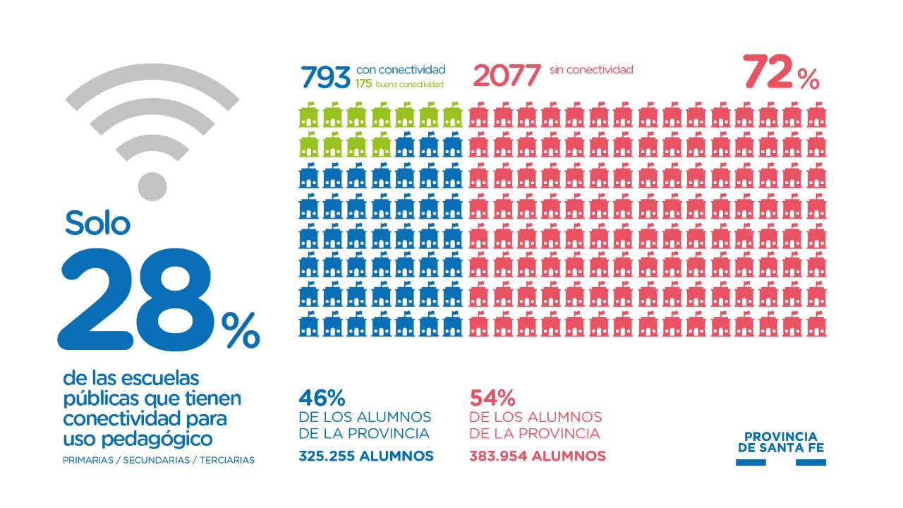 “Actualmente el 30,5% de los hogares santafesinos no tienen conexión a Internet y solo el 18,9% tiene una buena conexión. Lo que es aún más preocupante es que solo el 28%, 793 escuelas públicas, tiene conexión a Internet para uso pedagógico. Esta es una Internet que permita ver videos, tener a varios actores interactuando. Esto significa que más de la mitad de los alumnos santafesinos (383.954) no accedan a herramientas digitales en el aula”