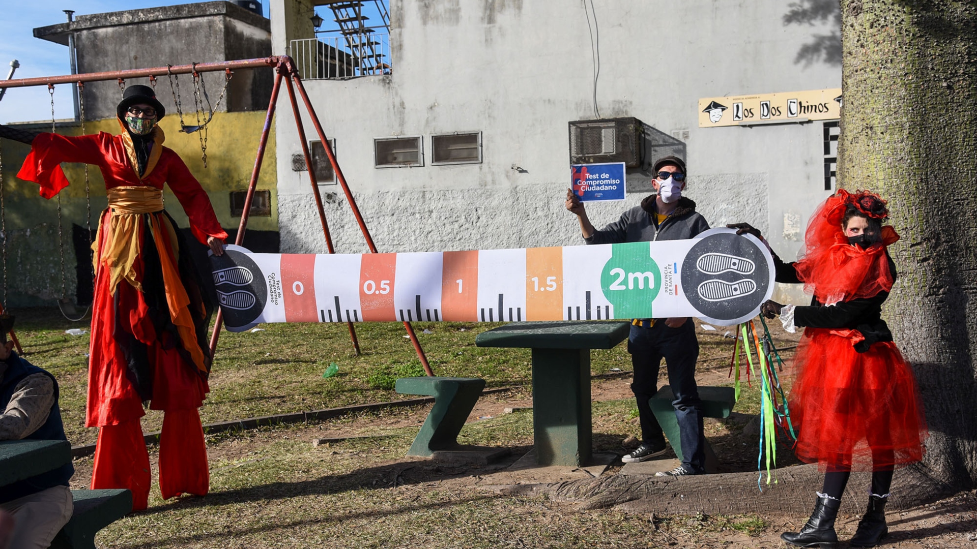Munidos de enormes reglas de dos metros, tapabocas, alcohol en gel y carteles, los artistas urbanos se metieron de lleno en las siestas santafesinas, intercambiando con niños y adultos las pautas de distanciamiento social, la necesidad del uso de barbijo y la importancia de la higiene de manos y calzado. Todos tomando mate, por supuesto, pero individualmente, cada uno con el suyo.