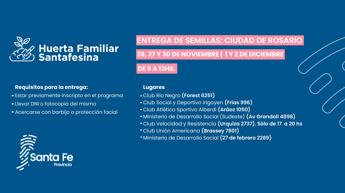 Las entregas serán el jueves 26, viernes 27, lunes 30 de noviembre, lunes 1 y martes 2 de diciembre y se realizarán en el Ministerio de Desarrollo Social (Av. Grandoli 4898 y 27 de Febrero 2289 ), Club Río Negro (Forest 6251), Club Social y Deportivo Irigoyen (Frías 996), Club Atlético Sportivo Alberdi (Aráoz 1050), Club Velocidad y Resistencia (Urquiza 2737- sólo de 17 a 20) y Club Unión Americana (Brassey 7801).