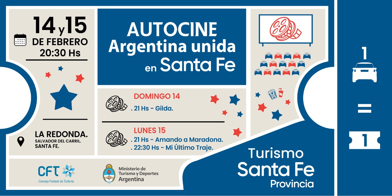La Secretaría de Turismo del Ministerio de Producción, Ciencia y Tecnología y el Ministerio de Cultura, sobre una propuesta del Ministerio de Turismo y Deportes de la Nación junto con el Consejo Federal de Turismo, llevarán adelante Autocine Argentina Unida, proyecciones que se realizarán el domingo 14 y lunes 15 de febrero próximos, en el estacionamiento de La Redonda, Arte y Vida Cotidiana (Salvador del Carril y Belgrano), en la ciudad de Santa Fe.