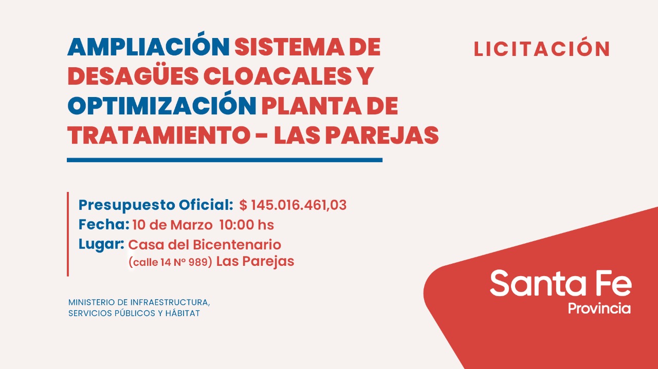 El Ministerio de Infraestructura, Servicios Públicos y Hábitat, a través de la Secretaría de Empresas y Servicios Públicos, llevará adelante la licitación para las obras de saneamiento para la ciudad de Las Parejas con un presupuesto oficial superior a 145 millones de pesos. Estos trabajos permitirán la ampliación del sistema de desagües cloacales y la optimización de la planta de líquidos cloacales, permitiendo incorporar las redes domiciliarias a más 3000 ciudadanos de Las Parejas.