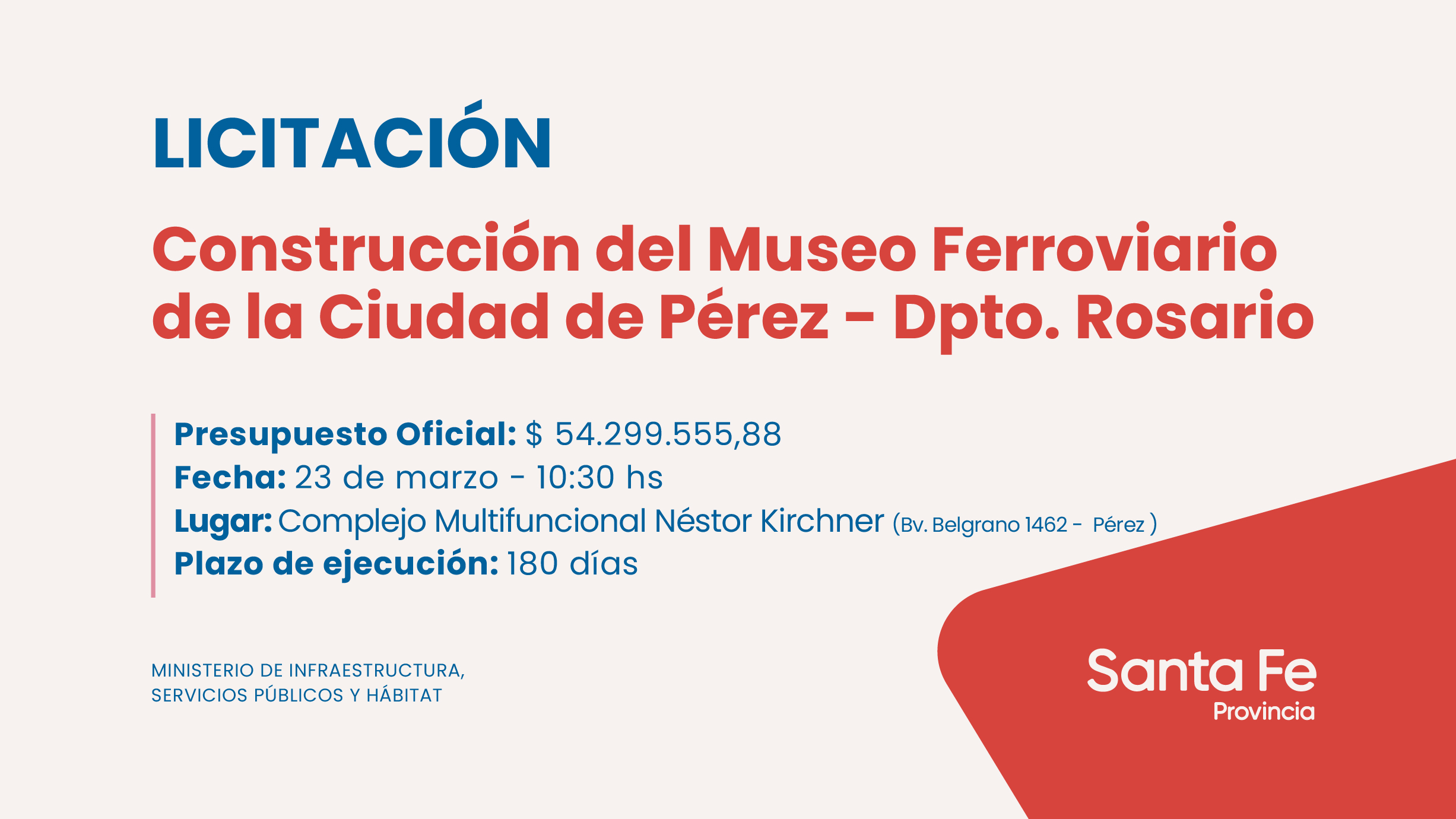 El acto licitatorio se desarrollará el día martes 23 de marzo a las 10:30 horas en el Complejo Multifuncional Néstor Kirchner-Bv. Belgrano 1462-de la localidad de Pérez.