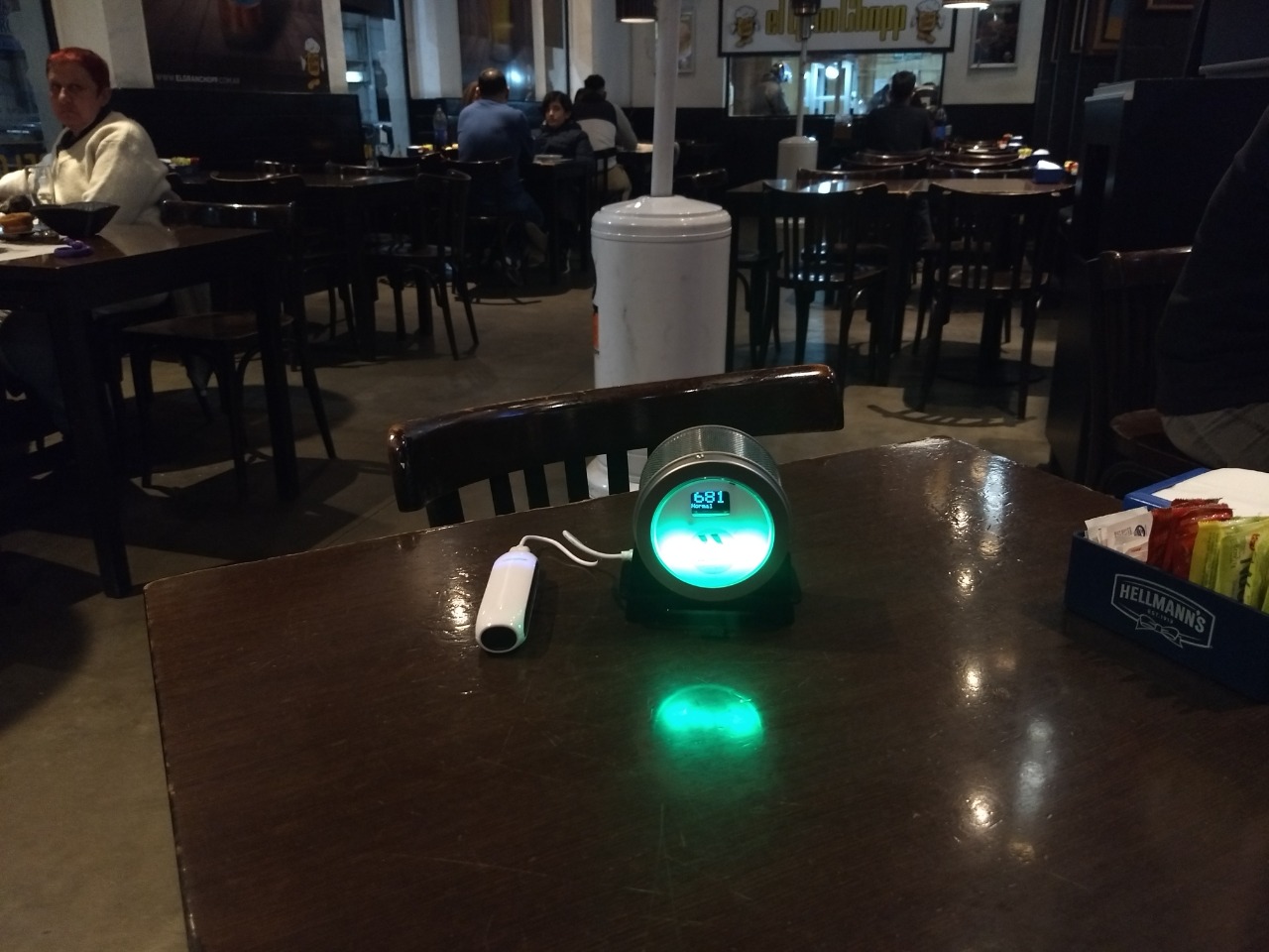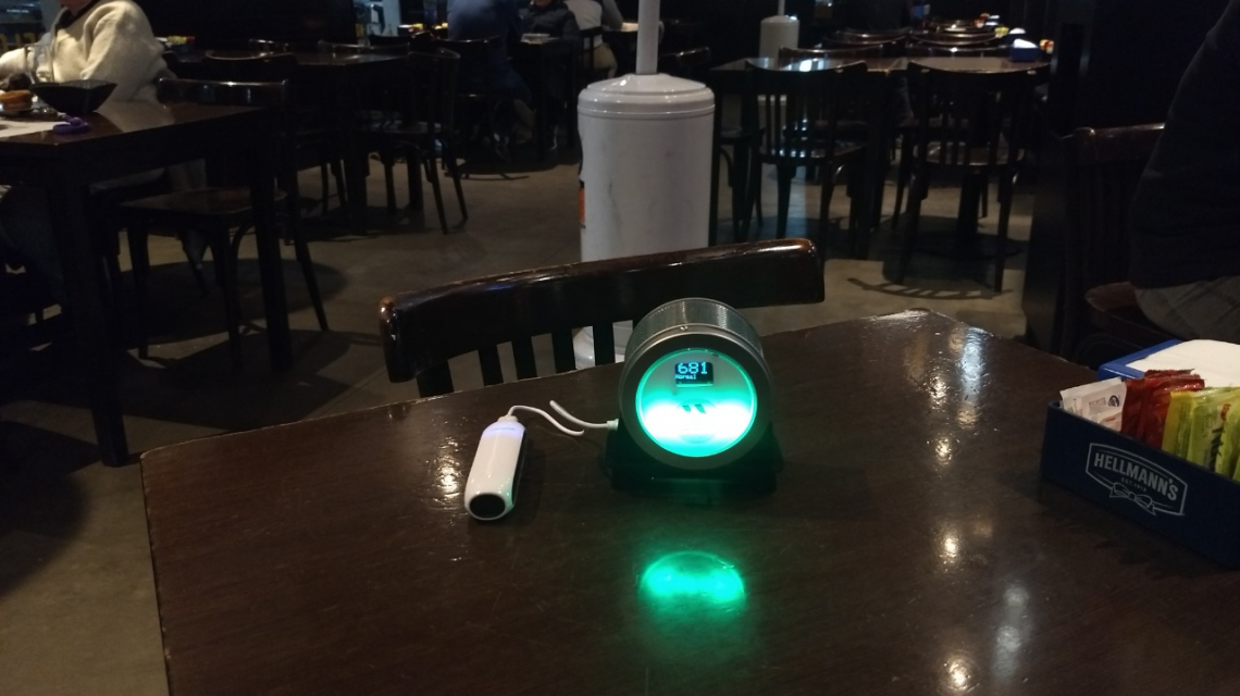 Se trata de un medidor de dióxido de carbono en el aire de un ambiente que se conecta a la red eléctrica y se accede a las mediciones a través de una plataforma online. Puesto a funcionar durante el tiempo aconsejado, emite una luz según el registro de medición de concentración de dicho elemento en la atmósfera: luz verde indica buena ventilación, luz amarilla señala ventilación defectuosa y luz roja informa acerca de un estado de ventilación malo, con la consecuente necesidad de modificar la calidad de dicho ambiente.