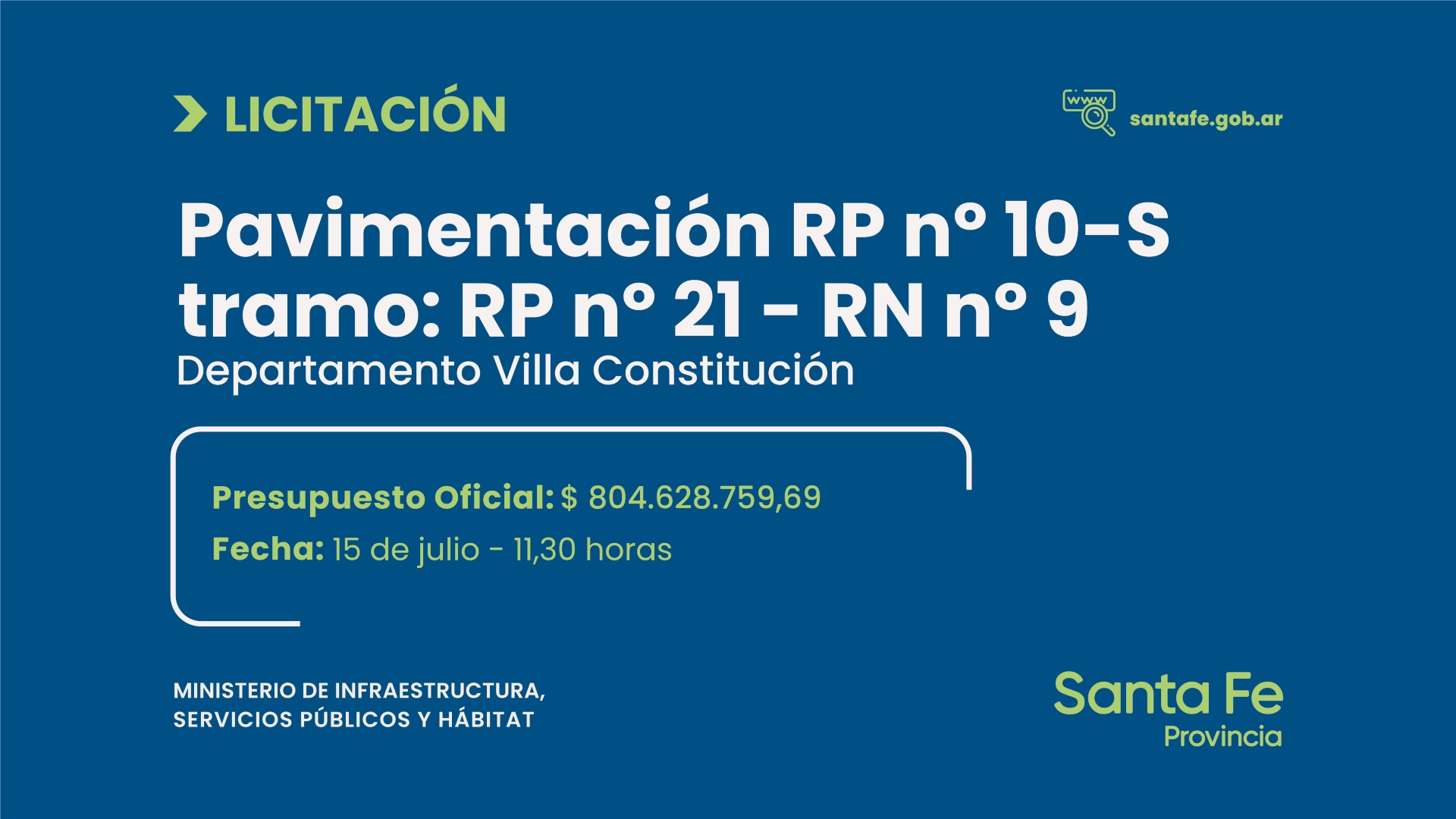 El presupuesto oficial asciende a $ 804.628.758,69 y el plazo de ejecución de los trabajos se fija en 16 meses.
