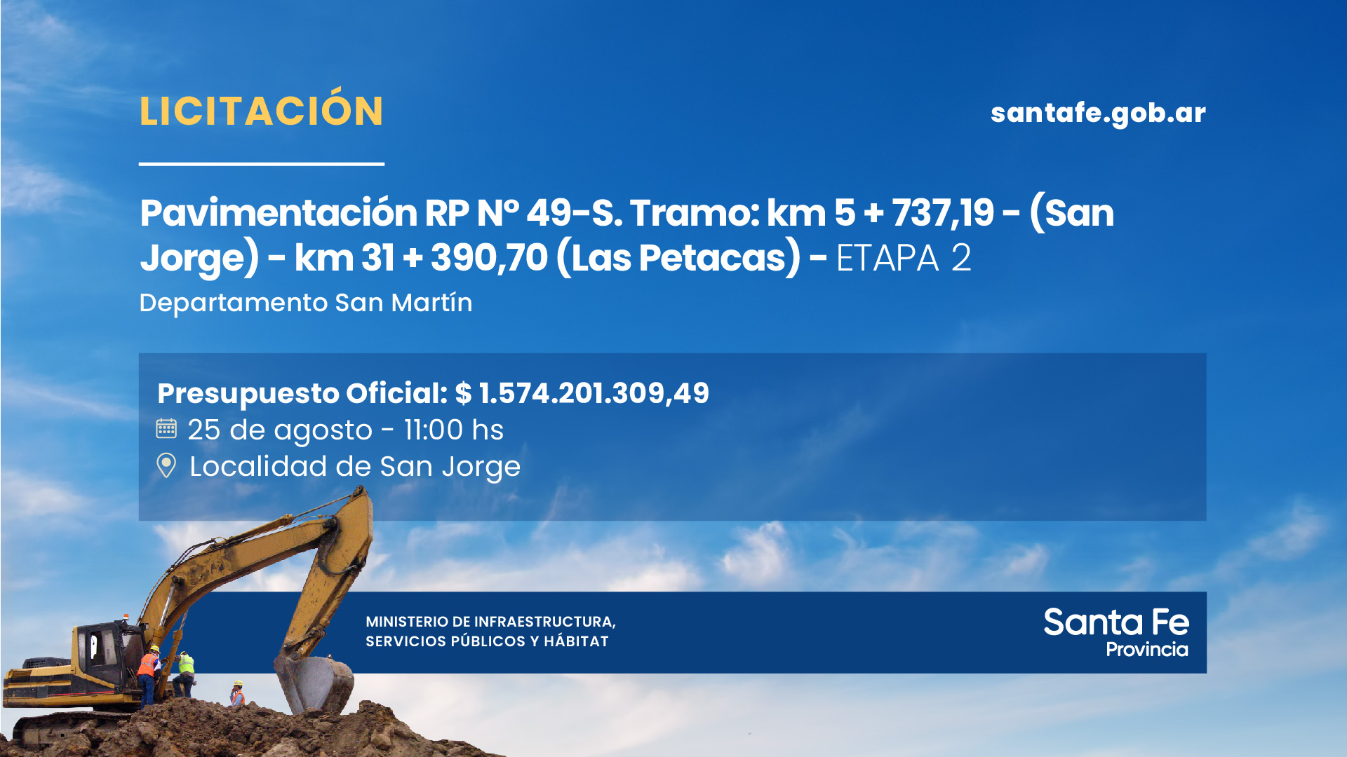 A las 12:30 hs, el gobernador Perotti estará presente en la habilitación de la obra de pavimentación de la circunvalación de Sastre, que comprende una extensión total de 3.500 metros, entre las rutas provinciales Nº 13 y Nº 64, departamento San Martín.