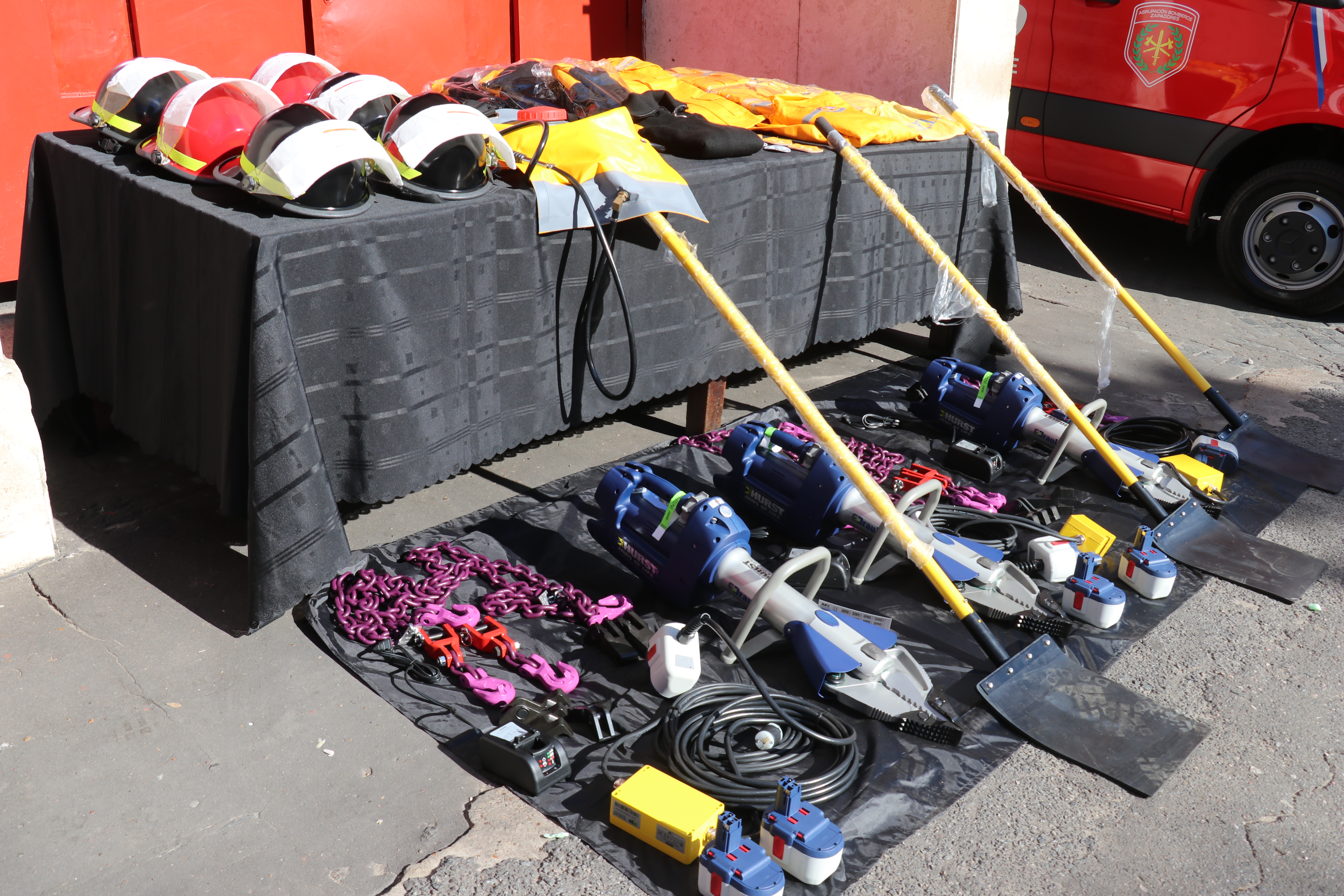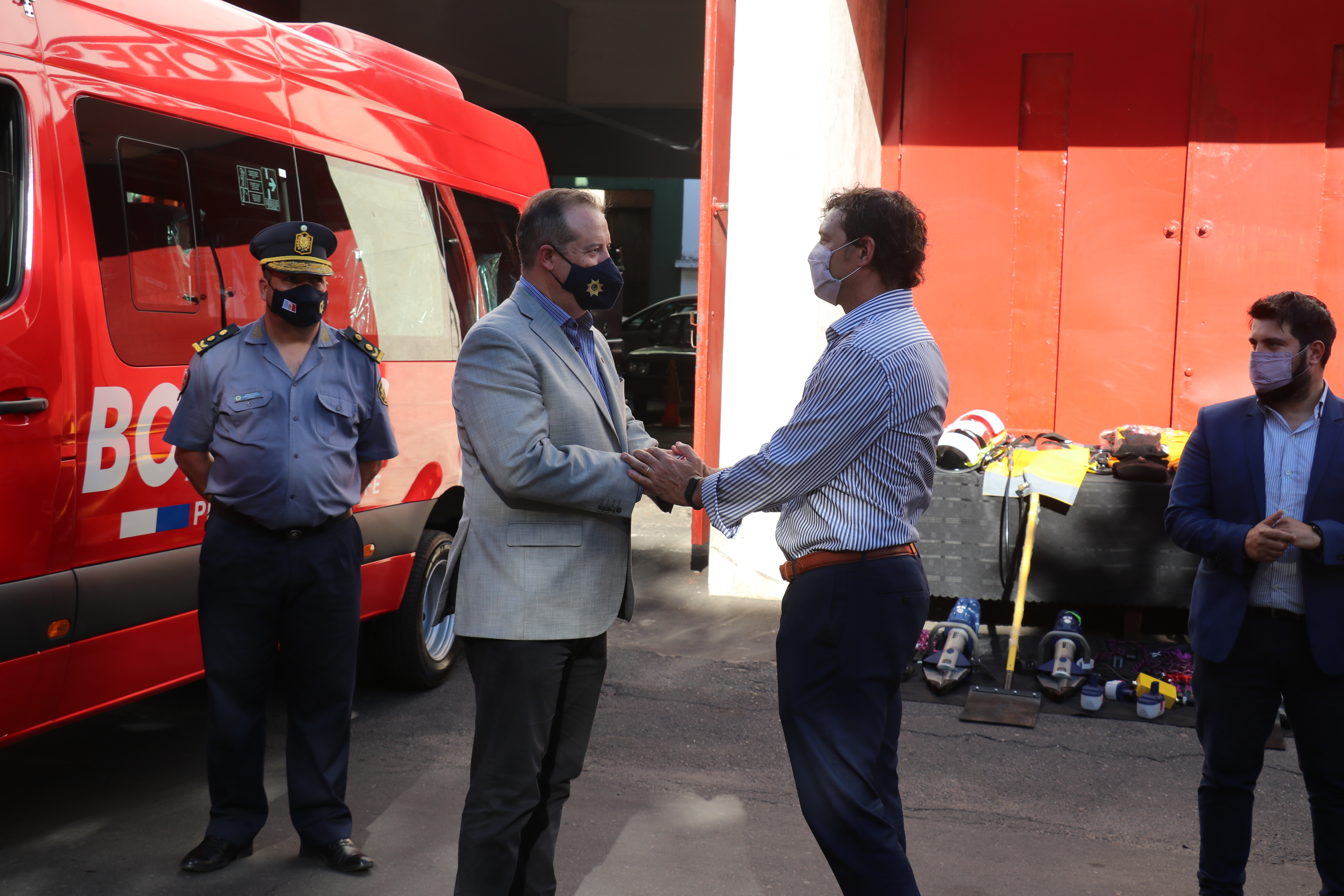 En esta oportunidad, la provincia entregó dos minibuses 0 km, tipo furgón con capacidad para traslado de hasta 20 personas, totalmente equipado, con balizas, equipo lumínico y sonoro, y ploteo con inscripciones y escudo de la Dirección General de Bomberos. Además, se entregaron 5 tijeras hidráulicas con accesorios para rescate vehicular, 400 CASCOS de incendio y 40 prendas para el grupo especial GERZ