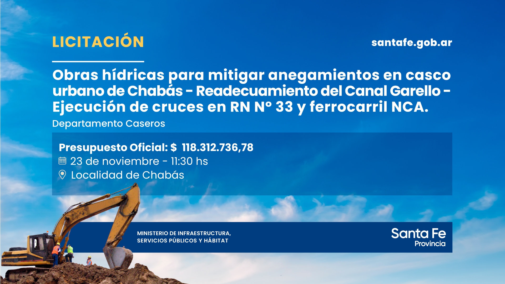 El acto de apertura de ofertas se realizará el martes 23 de noviembre, a las 11.30 horas en la Sala de la Cultura, sita en RNNº 33 y calle General Roca, en Chabás.