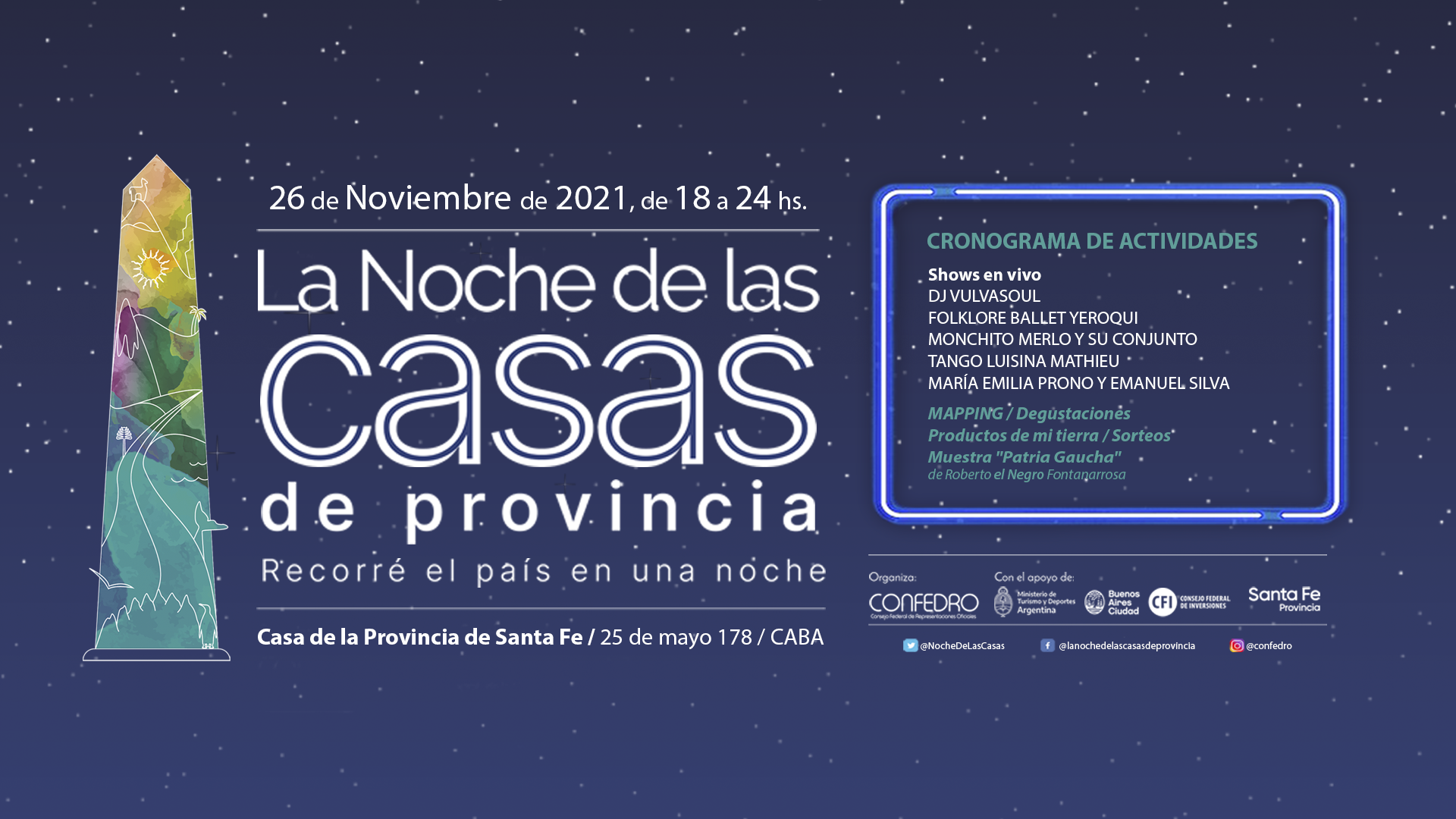 En la oportunidad, las representaciones oficiales en la ciudad de Buenos Aires abrirán sus puertas para mostrar la amplia y diversa oferta turística, cultural y gastronómica, visibilizando a los artistas y las diferentes expresiones culturales, y mostrando al público una experiencia única, representativa de la diversidad e integración que ofrece la Argentina.