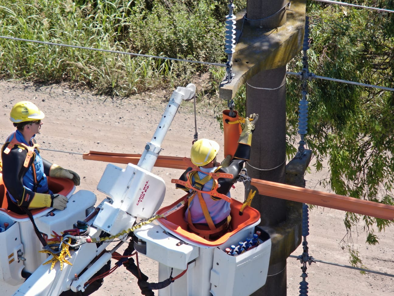 Se trata de tareas específicas desarrolladas durante dos semanas por cuadrillas especializadas de Firmat y San Lorenzo, que se ejecutan con tensión y que consisten en el recambio de aisladores, ataduras y otros materiales, tomando contacto los operarios con conductores de electricidad y equipos que transportan 33 kV.