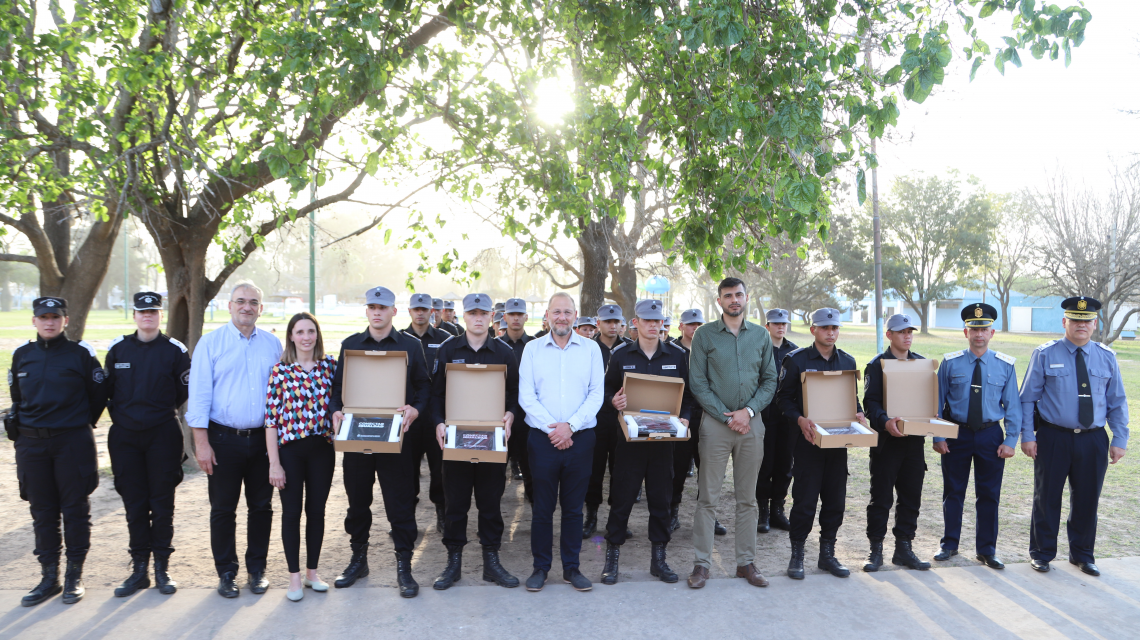 Del acto, realizado en la Escuela de Policía de Rafaela, participaron el ministro de Gestión Pública, Marcos Corach; y el secretario de Prevención en Seguridad de la Municipalidad de Rafaela, Maximiliano Postovit.