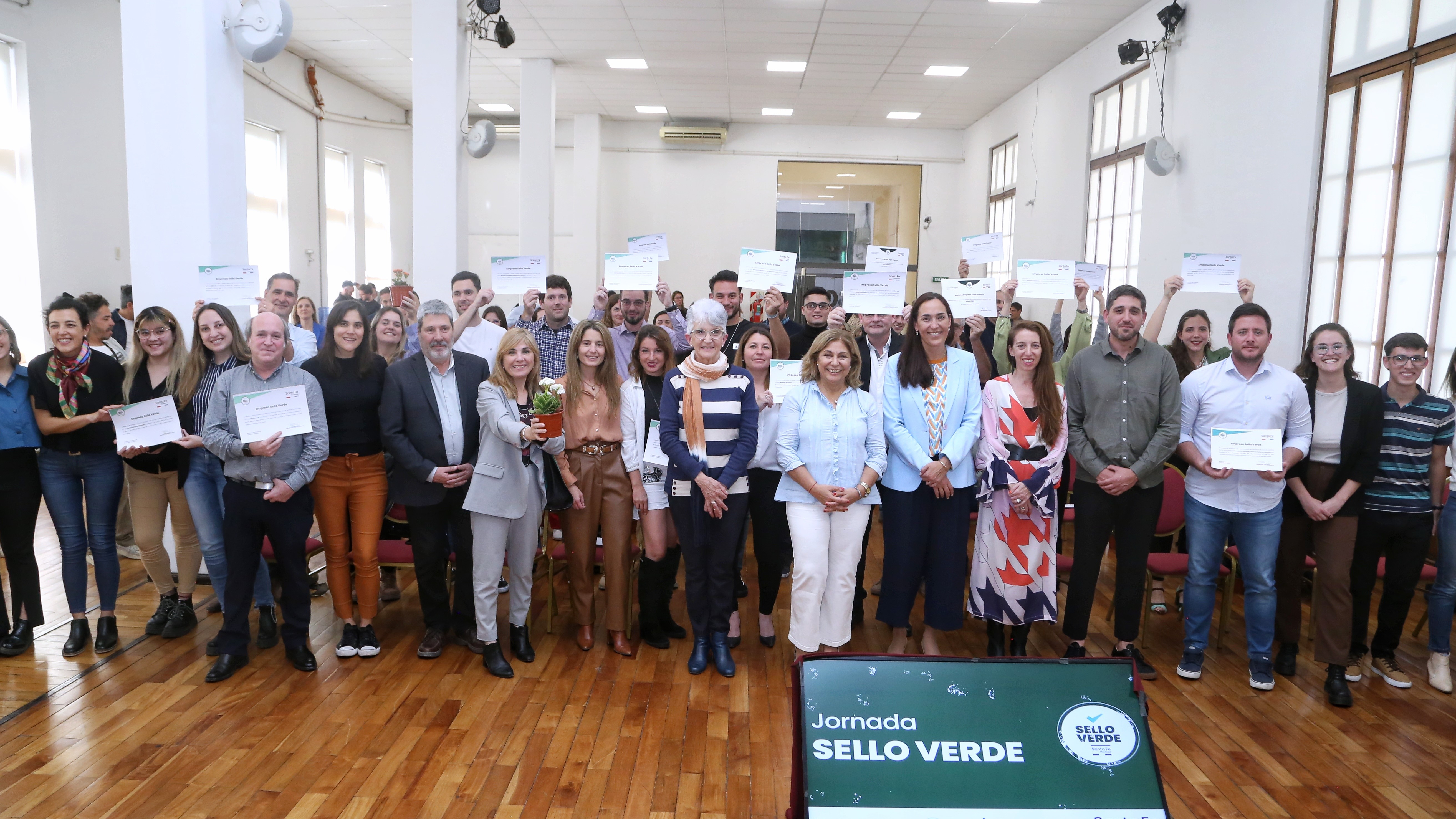 Durante la jornada se entregaron las primeras certificaciones de sellos verdes a representantes de empresas santafesinas que han obtenido el reconocimiento. Participaron: Armando Moreira de Aguas y Procesos (Sunchales), Jorgelina Curetti de Asociación Civil Eco Marea (Pérez); Lorena Rougier de Desinmec Ingeniería S.A. (San Carlos Sud); Antonella Druetta por DHSH S.R.L. (Capitán Bermúdez); Oscar Marana por Eco Aislación S.R.L. (Colonia San José); Hilarión Del Olmo por Explora S.A. (Puerto General San Martín); Angel Losa de GANI S.A. (Sauce Viejo); Máximo Geminelli de Geminelli S.A. (Pérez); Nicolás Caffarengo por Evercaff Ecotablas (Rosario); Marcelo Cogno por NOVA S.A.U. (Cañada de Gómez); Laura Cardenas de Rosario Bioenergy (Rosario); Agustín Caro de Servicios Cerveceros Crowntainer S.R.L. (Rosario); Juan Ignacio Mondiglio de Sipel S.R.L. (Rosario); Leonardelli Marcelo de Solamb S.R.L. (San Lorenzo); María Laura Allegri de Cook Express S.R.L. (Rosario) y Federico Bagnera de Cooperativa Guillermo Lehmann (Pilar).