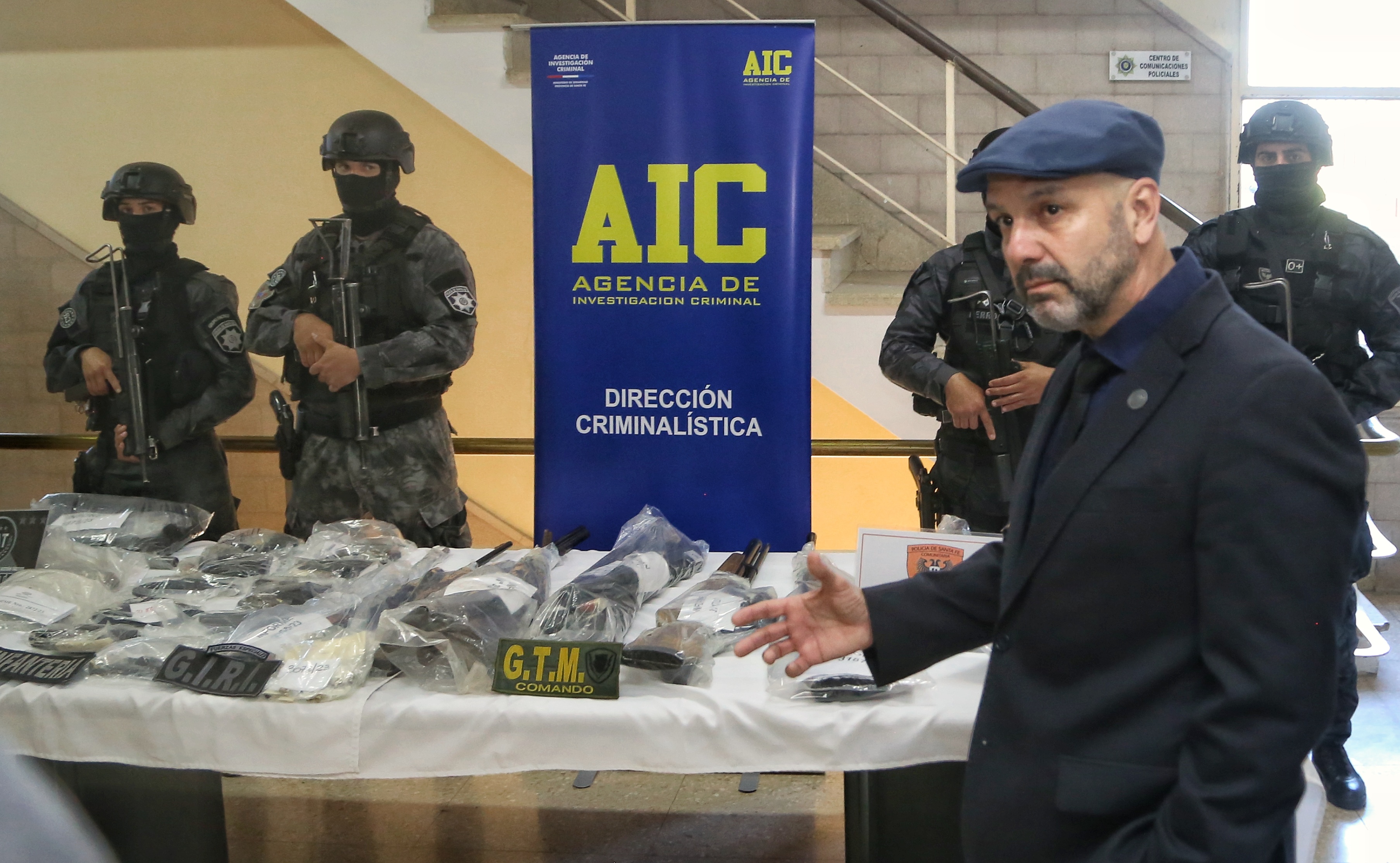 En dialogo con la prensa, el ministro explicó: “Hoy, como lo hacemos tres veces por semana, juntamos todo el material balístico que se incauta en distintos procedimientos. En esta oportunidad, tenemos 39 armas de distintos calibres: 9mm, 38mm, 32mm. Hay escopetas, rifles, fusiles. Hay también algunos chalecos de antibala que fueron incautados por la Policía de la Provincia de Santa Fe. Estas 39 armas que hoy estamos mostrando son producto de las incautaciones de dos días. Dos días, 39 armas de fuego de distintos calibres, con todo el potencial daño que puede producir”.