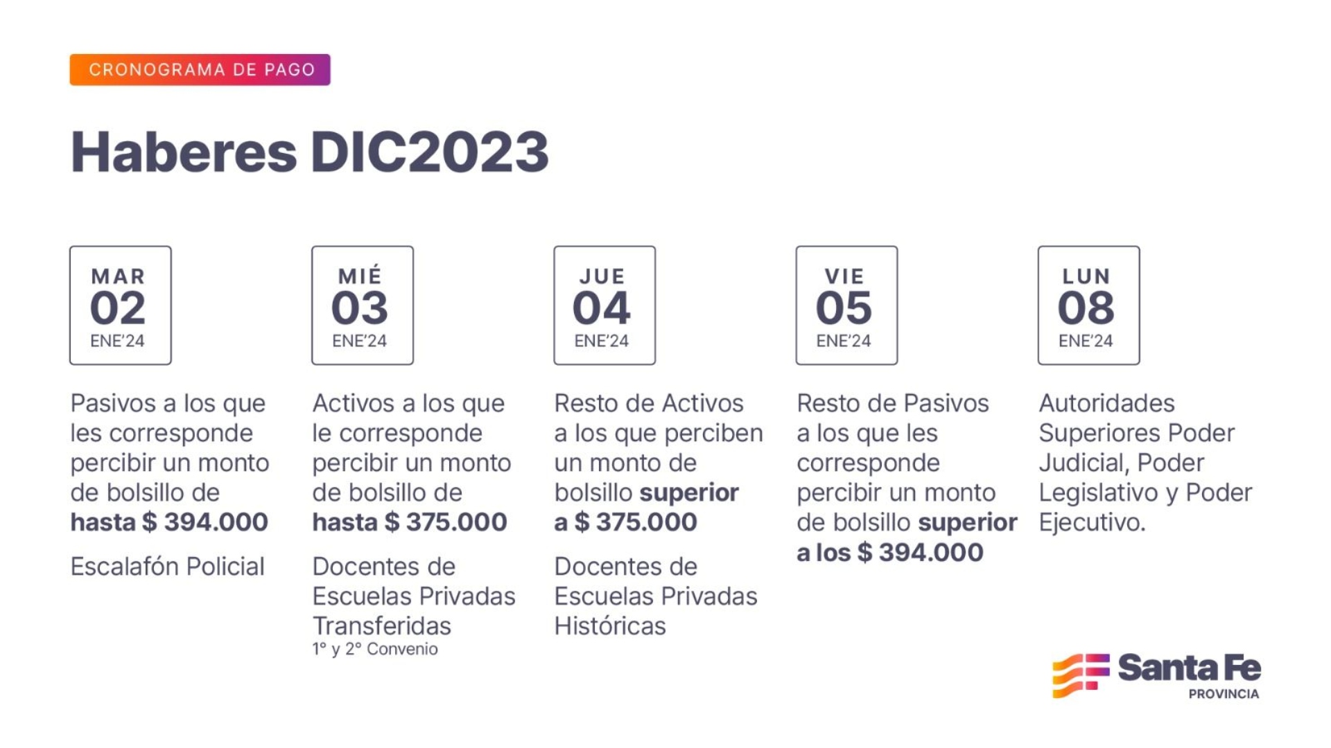 El cronograma para los agentes públicos se iniciará el martes 2 de enero, finalizando el viernes 5. En tanto las autoridades superiores de los tres poderes percibirán sus haberes el lunes 8.