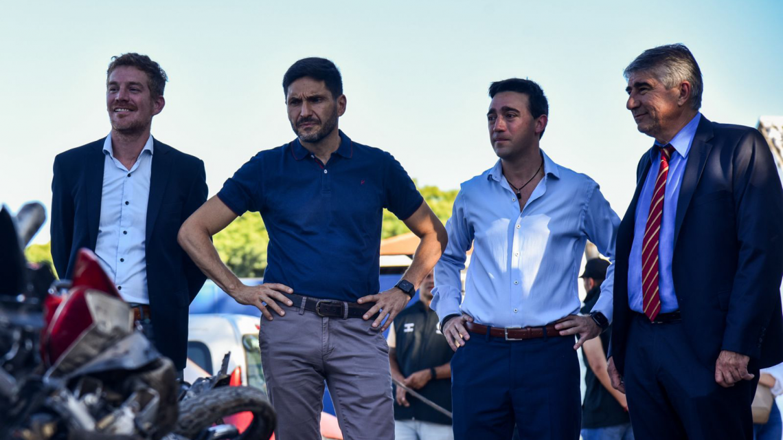 El gobernador Maximiliano Pullaro y el ministro de Gobierno e Innovación Pública, Fabián Bastía, participaron este martes del inicio de la compactación de 400 vehículos, que se encontraban bajo custodia de la Agencia Provincial de Registro, Administración y Destino de Bienes y Derechos Patrimoniales (Aprad), y que debido al estado de abandono en que se los dejó durante los últimos 4 años, deben ser destruidos.