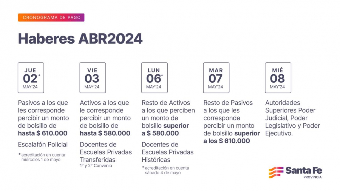 El Gobierno provincial abonará los haberes de abril a partir del jueves 2 de mayo hasta el miércoles 8. Personal policial y pasivos que cobren hasta $ 610.000 podrán disponer del pago a partir de este miércoles 1 de mayo.