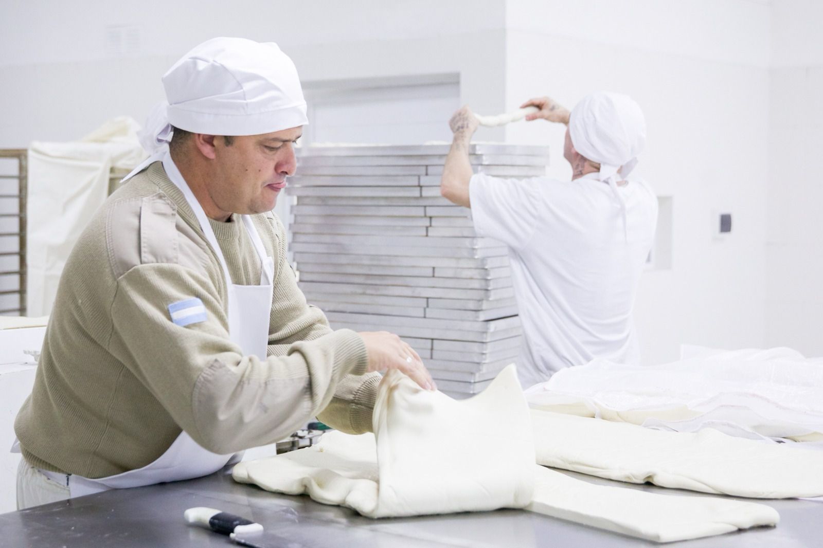 En ese sentido, Daniel, maestro panadero y encargado del taller, contó: “Hace dos semanas arrancamos a poner en marcha las máquinas, con poca elaboración para algunas donaciones, y hoy empezamos en mayor cantidad para la producción. La capacitación de los internos está a cargo nuestra, les enseñamos el uso de las máquinas y el proceso de elaboración. Ellos vienen con ganas de trabajar, ya están en periodo de prueba, en salidas transitorias, y esto es una capacitación y algo que los puede ayudar afuera”.