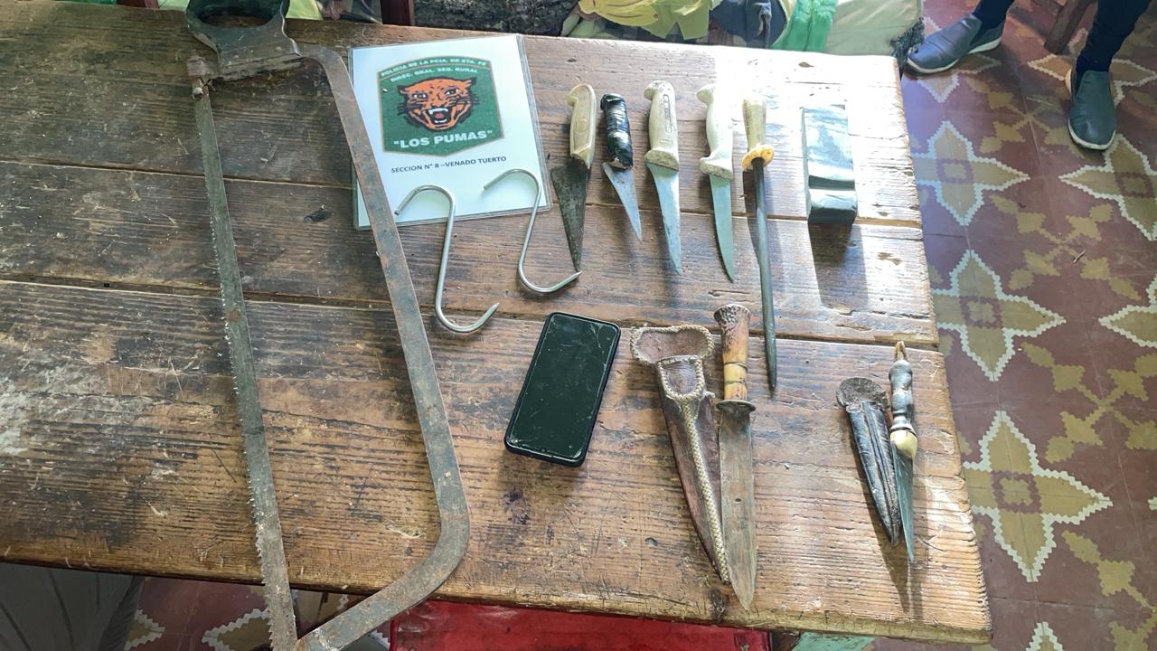 En un megaoperativo coordinado entre “Los Pumas” de General López, la Policía de Investigaciones (PDI) región Venado Tuerto y la Patrulla Rural de General Arenales dependiente de la Policía de la provincia de Buenos Aires se secuestraron 1 Pick Up Toyota Hilux 4x4 color negra y otra S10 color blanca, 11 cuchillas, 21 cuchillos, 6 chairas, 9 teléfonos celulares, 9 ganchos, 3 sierras de carnicero de 1 metro,1 aparejo con gancho tipo percha, 1 mesa de aluminio de desposte, 6 bolsas con cortes de carne vacuna, 2 trozos cárnicos , cuerdas varias, 1 malacate, 1 pinza alicate, 1 hacha, 1 sierra sinfín eléctrica marca Bianchi y 2 hojas de sierra sinfín.